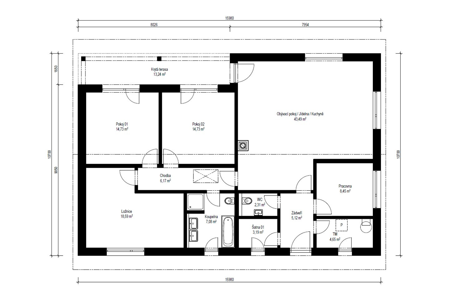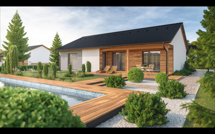 Úctyhodných 129 m2 bungalovu Instinkt 2-129 je užitná plocha, která bude vyhovovat i těm nejnáročnějším uživatelům. Francouzská okna nabízejí možnost vyjít z obývacího a obou menších pokojů rovnou na krytou terasu. Půdorys je přizpůsobený současnému stylu života. Kromě dvou menších pokojů jistě oceníte prostorný obývací pokoj s kuchyní a jídelnou, stejně jako dostatečně velkou ložnici a jako bonus pracovnu.