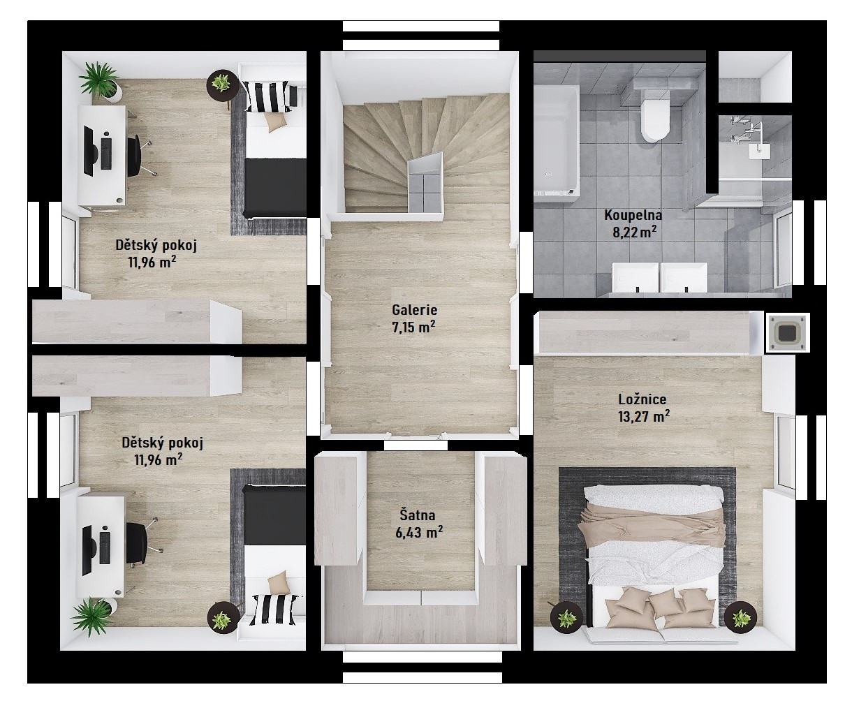 Patrový rodinný dům Skywood 2-126 nabízí celkem 126 m2 užitné plochy. Dispozice 4 + KK s garáží vám hned po vstupu do interiéru nabídne vstupní halu se schodištěm do patra. Z haly se vstupuje do velkého obývacího pokoje, spojeného s kuchyňským koutem a jídelnou, do technické místnosti s WC a do garáže. V patře jsou pak tři další pokoje, šatna a velká koupelna s WC.