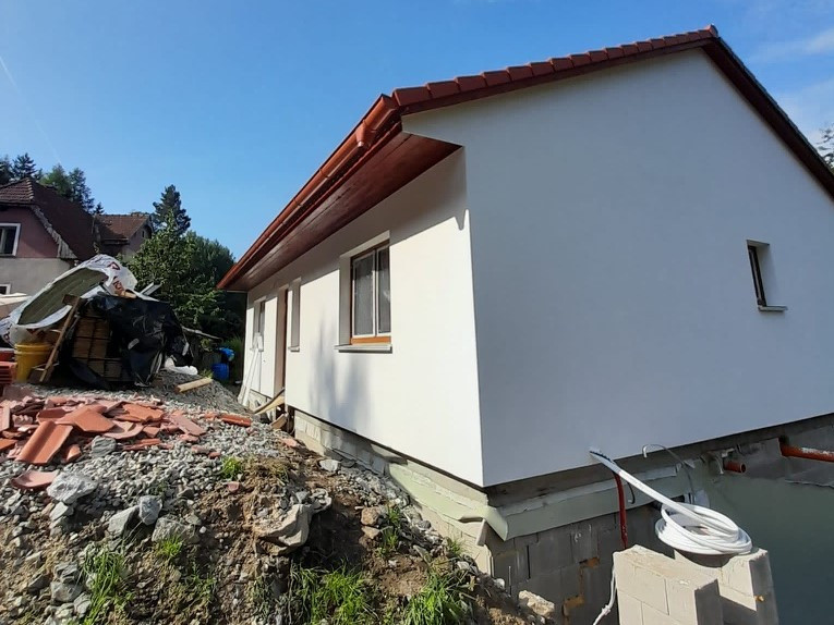 Bungalov Rapido 2-81, který právě dokončujeme na Českokrumlovsku je umístěn ve svahu, proto se přímo nabízelo dům podsklepit. Spodní stavbu si klient zajistil sám a my jsme samotný rodinný dům začali stavět na začátku června. Po 27 pracovních dnech je dům ve stupni dokončení ECONOMY hotový. Klient si musí ve vlastní režii dodělat povrchy (obklady, dlažby, podlahy, vytmelení stěn a výmalby), osadit zařizovací předměty v koupelně a na WC a také doplnit všechny vnitřní dveře. Přesto využívá veškerých výhod standardu Haas PREMIUM – tedy tepelného čerpadla, podlahového topení nebo komína.