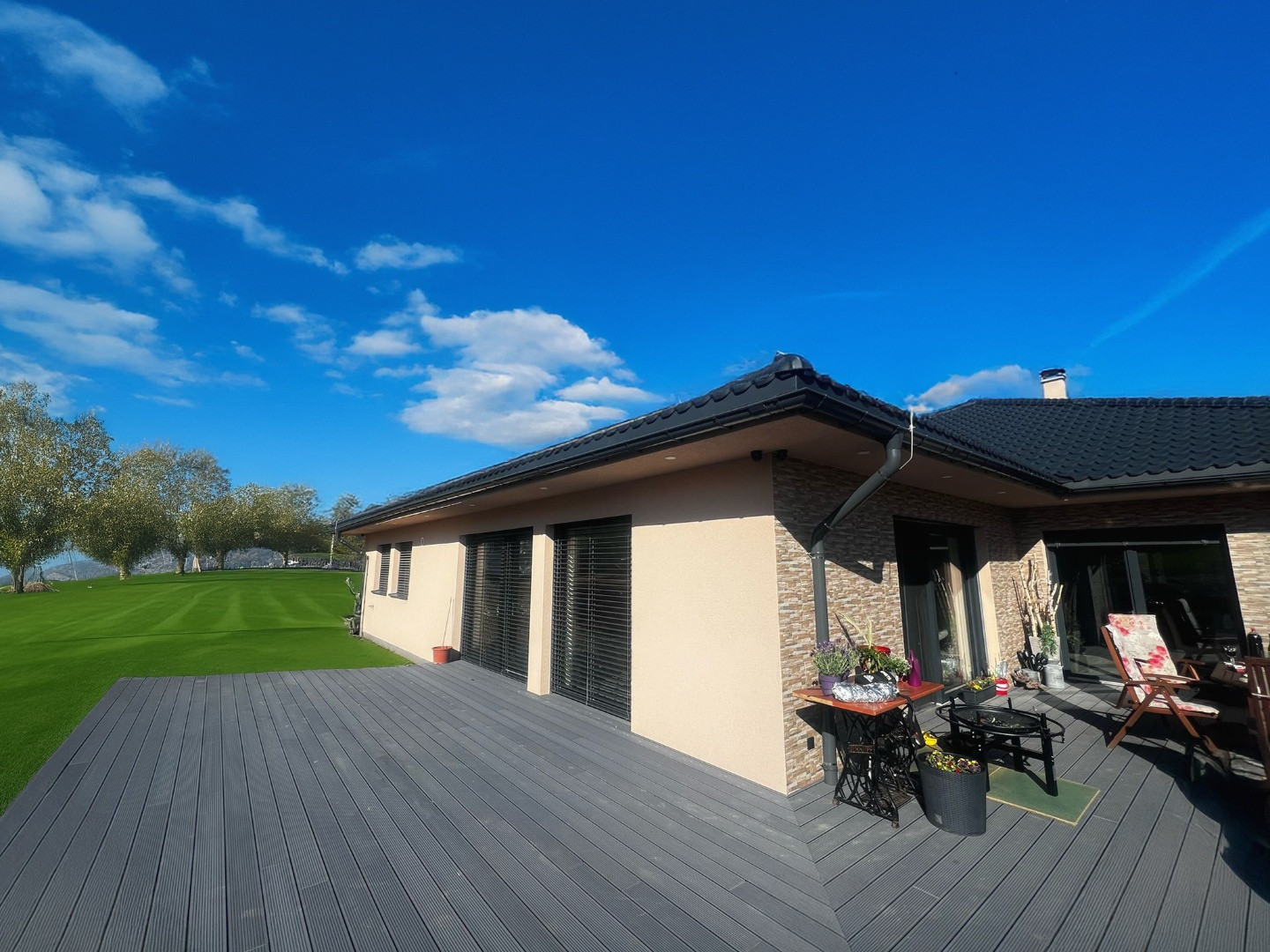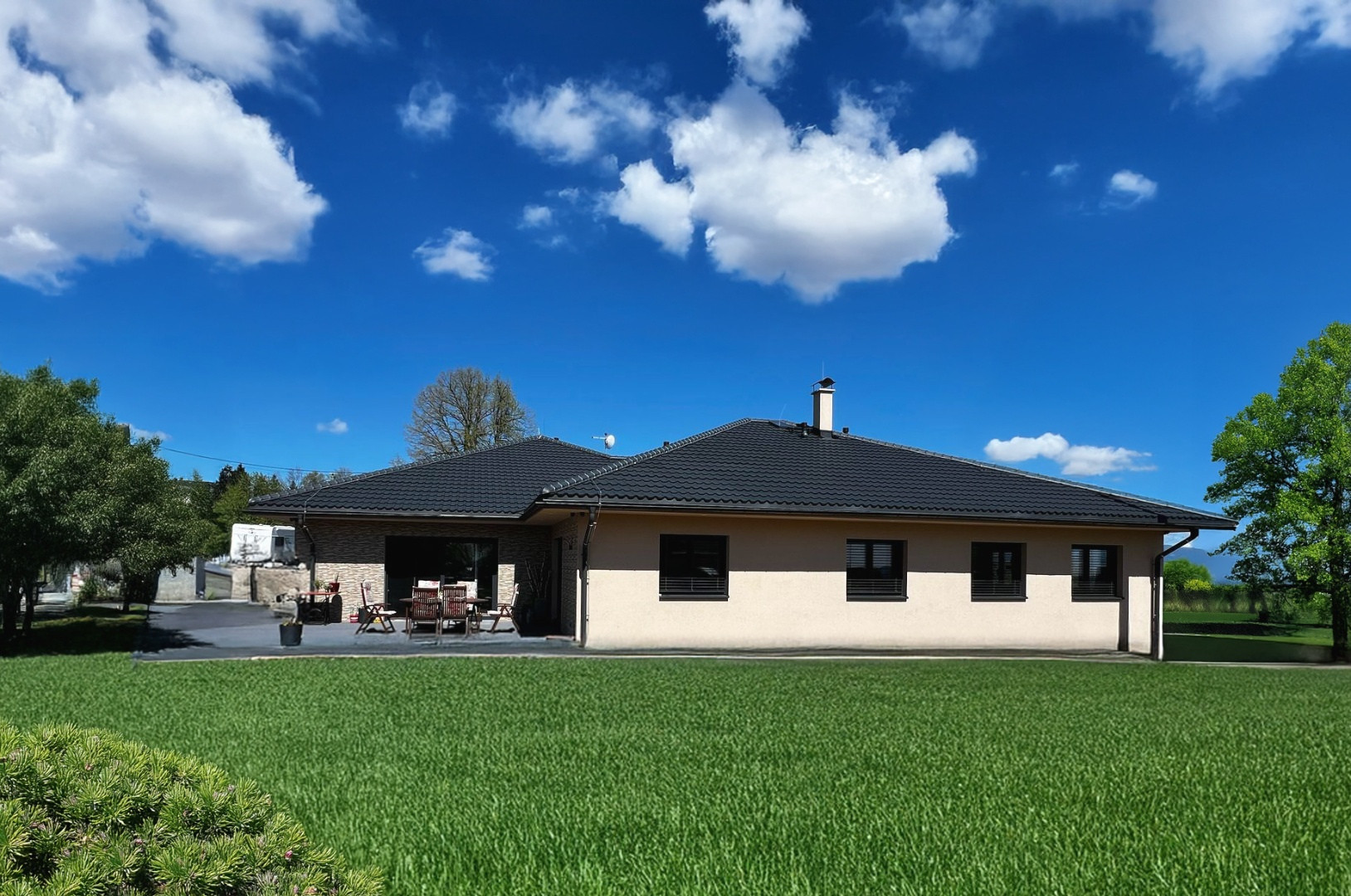 Elegantní valbová střecha, kamenné obložení fasády