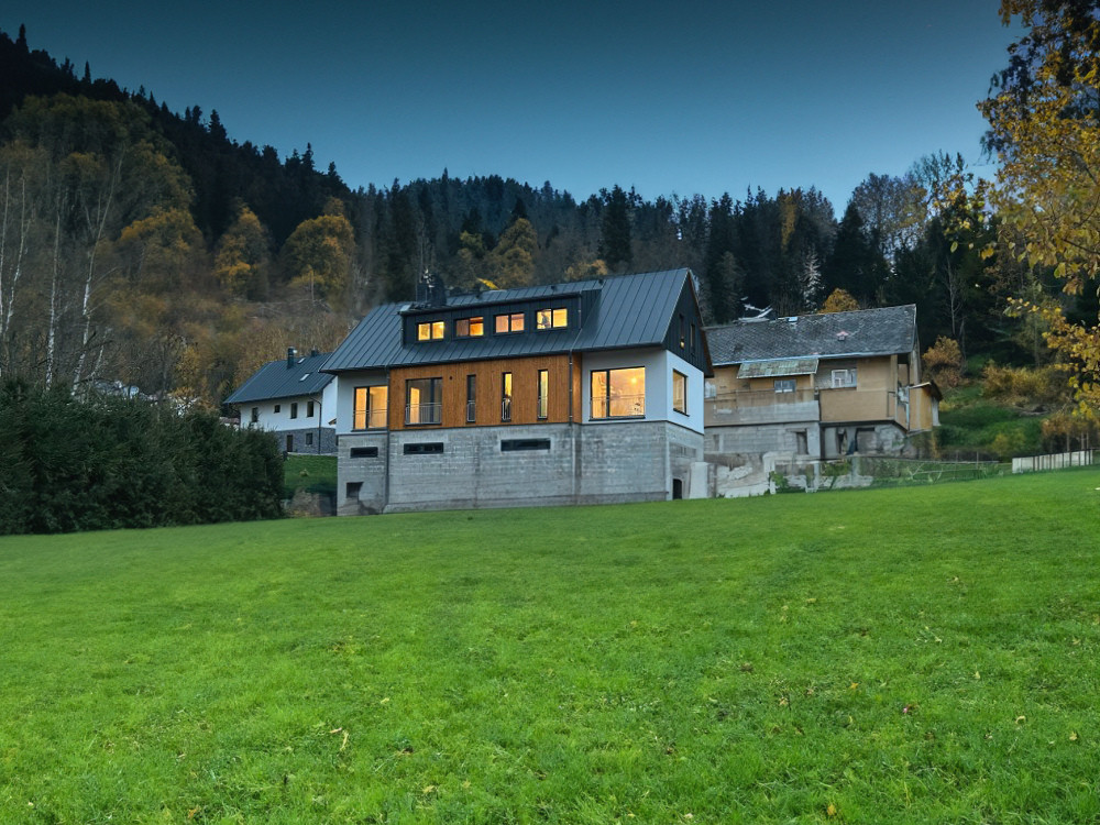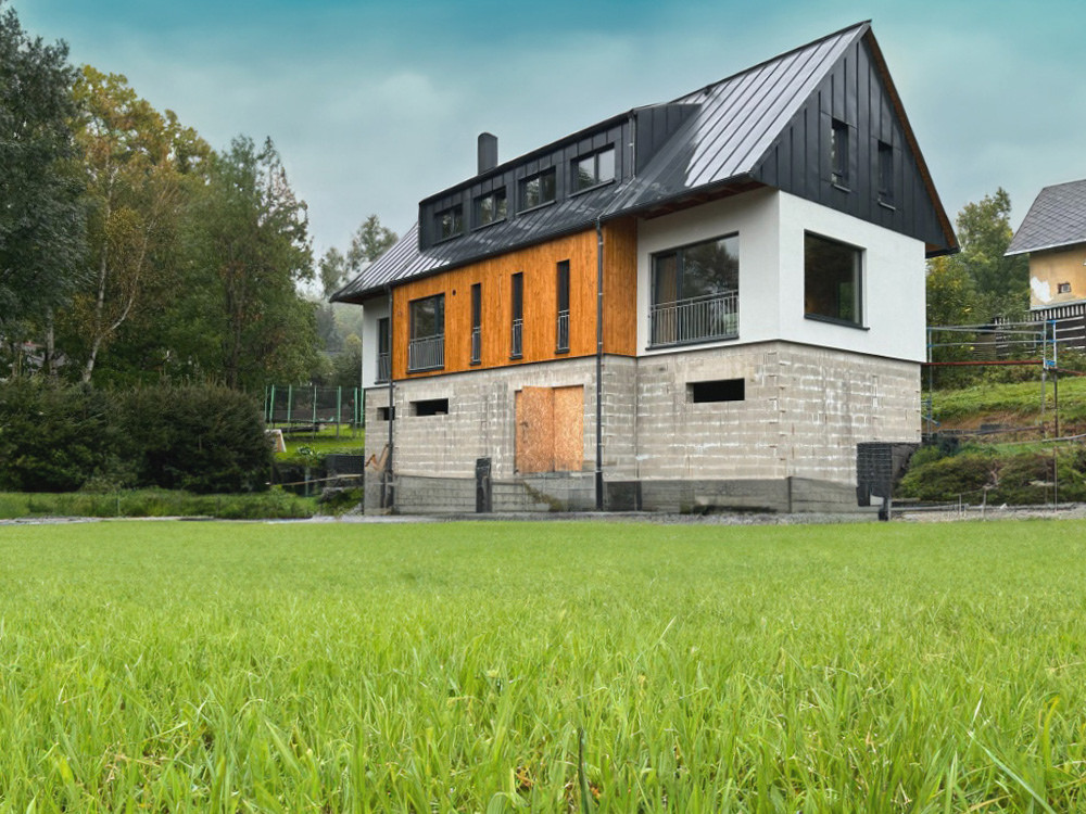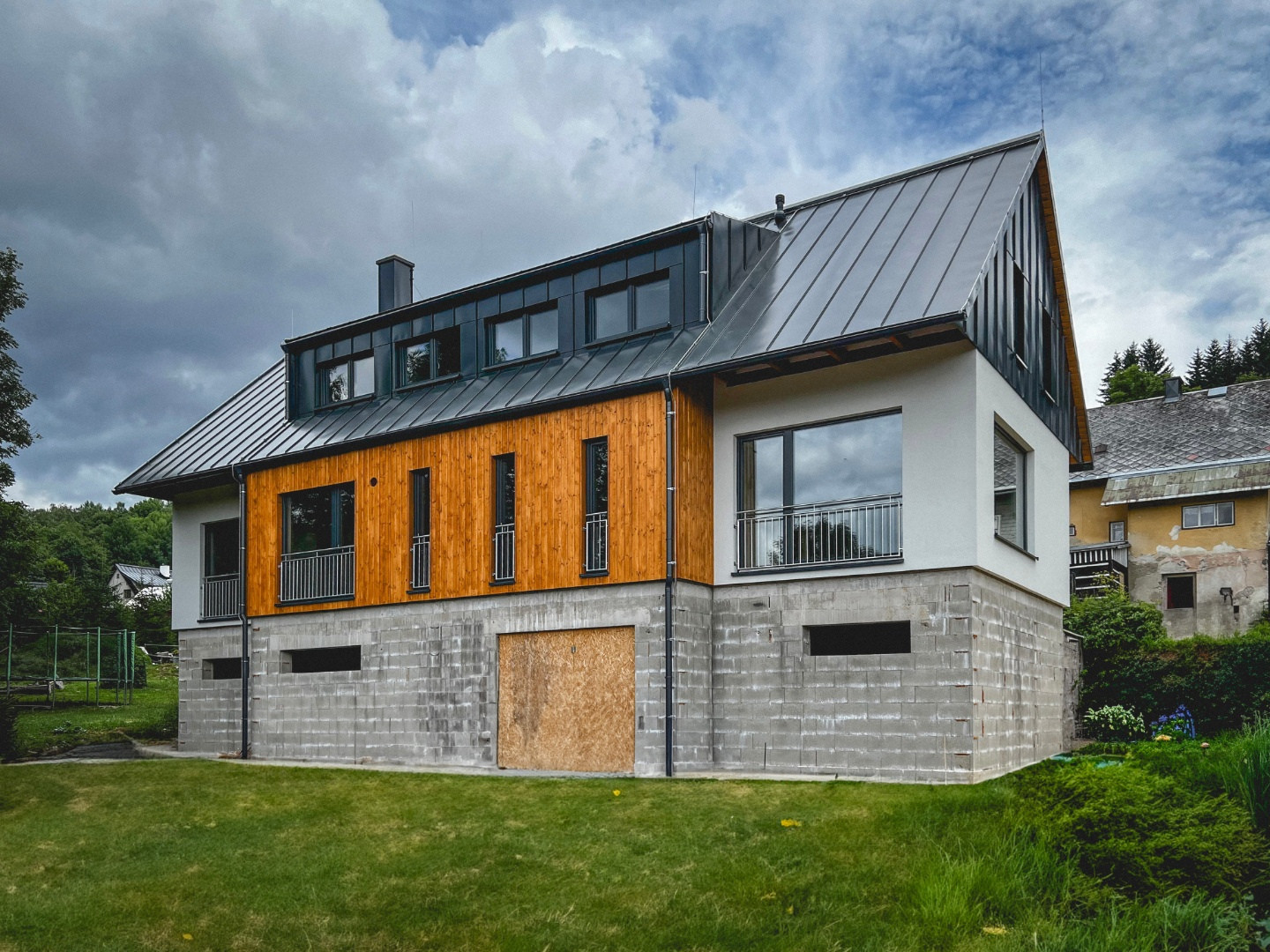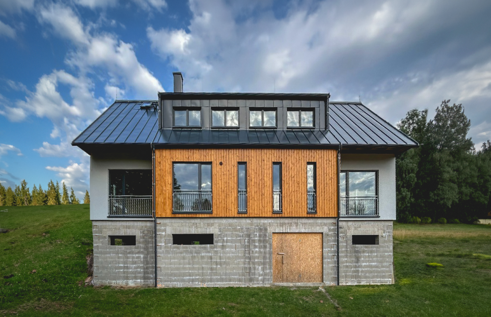 V malebné krajině Rokytnice nad Jizerou vyrostl rodinný dům, který svým vzhledem perfektně zapadá do okolní přírody. Zvenku je obložený kamenem a dřevem, střešní krytina je plechová. Skládá se ze tří samostatných bytů.