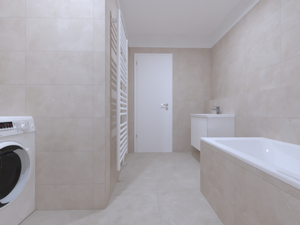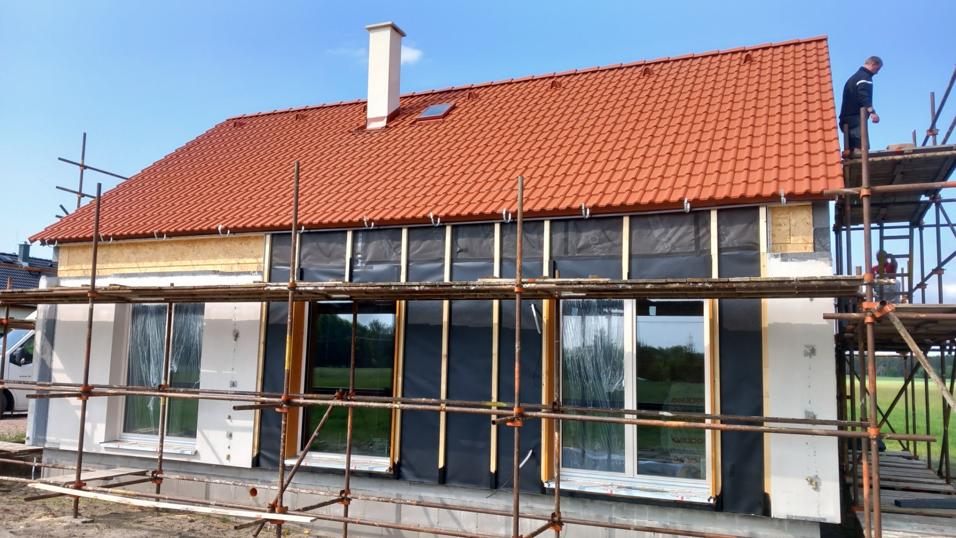 Rodinný dům stavíme ve standardu Haas PREMIUM, to znamená, že bude vybaven tepelným čerpadlem, podlahovým topením i komínem pro připojení krbu nebo krbových kamen. Zvenku zdobí fasádu bungalovu obložení ze smrkových palubek, zapuštěných do fasády.