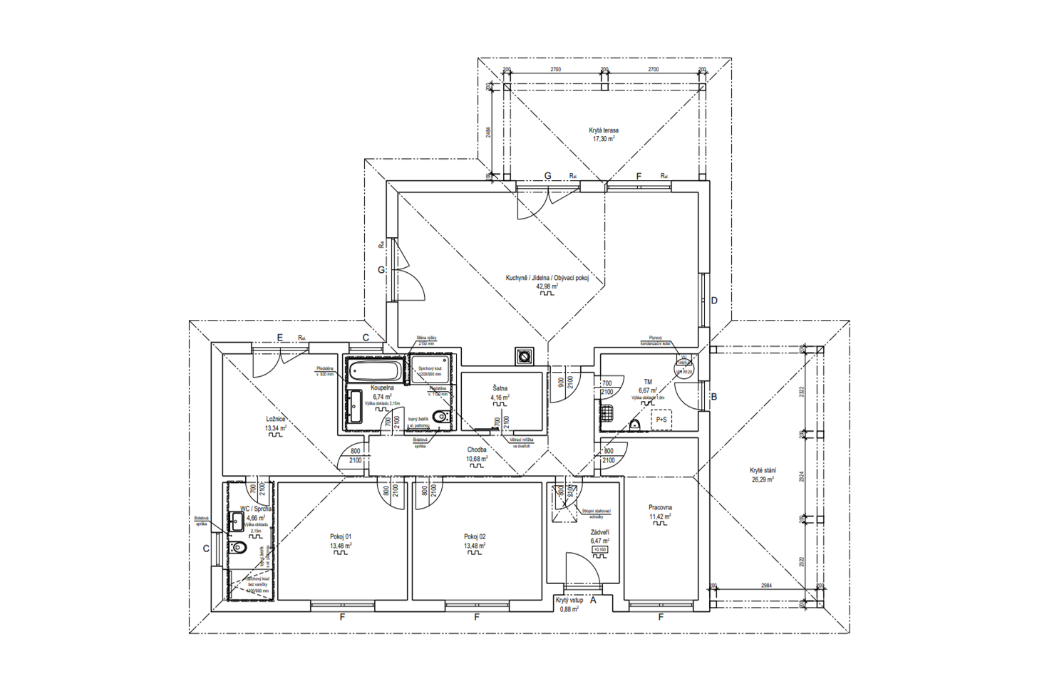 O tam jak by měl nový dům vypadat, měli majitelé jasnou představu na jejímž základě vznikl projekt bungalovu, který přesně odpovídá všem jejich požadavkům. Dispozice 5 + KK je doplněna prostornou šatnou a druhou koupelnou přístupnou z ložnice. Technická místnost je samozřejmostí a nezbytností. V ní je umístěn i plynový kondenzační kotel, který vytápí s pomocí teplovodního podlahového topení celý dům. Přes technickou místnost se dá do domu pohodlně dostat z krytého stání pro auto. A krytá je i veliká terasa s výhledem do zahrady, která navazuje na obývací pokoj s kuchyní a jídelnou.