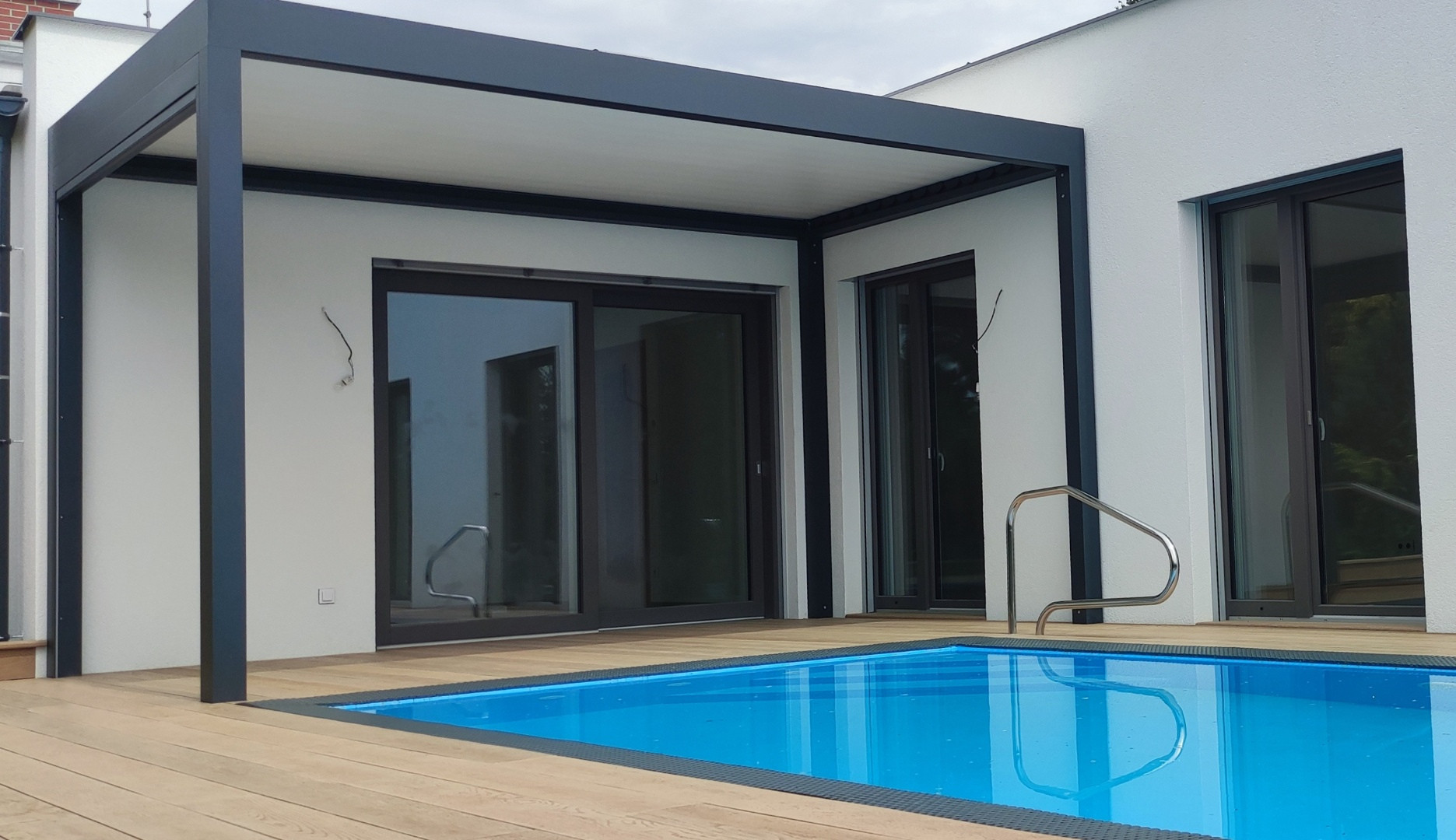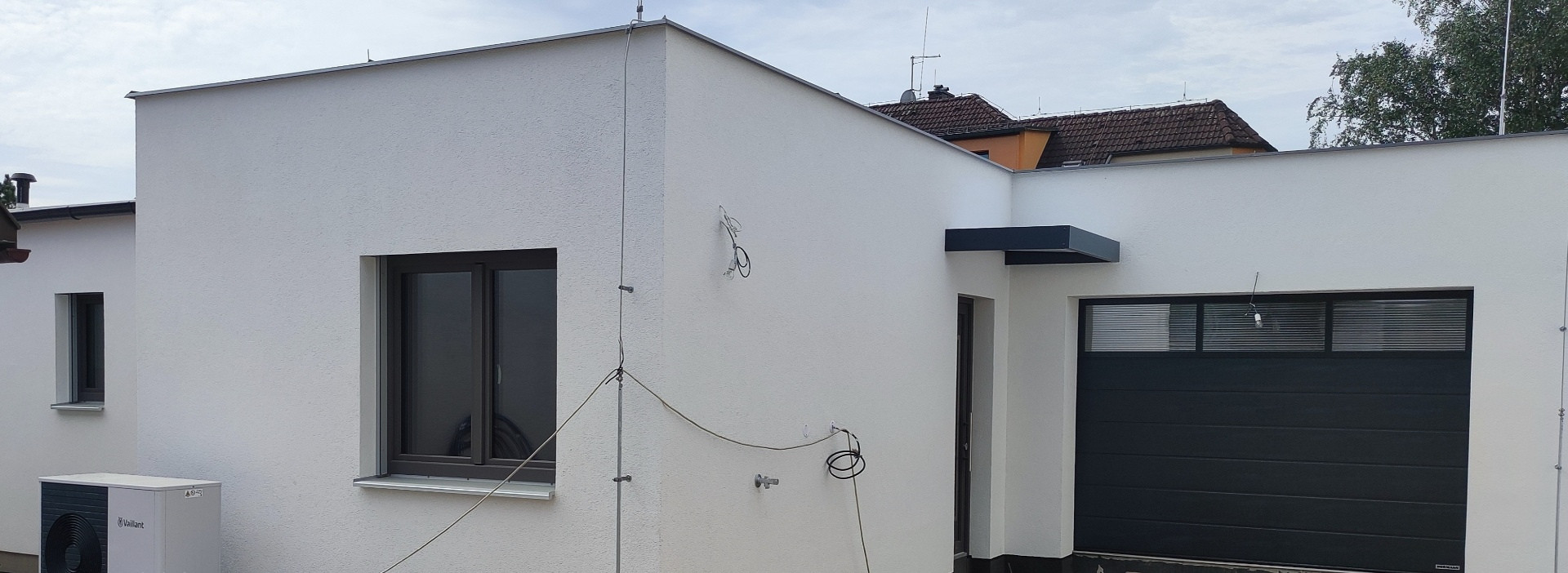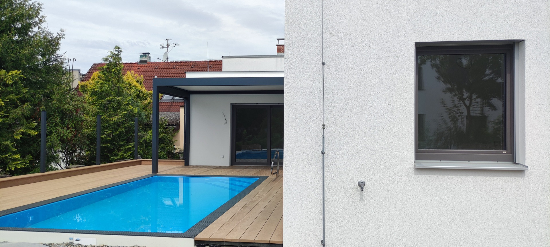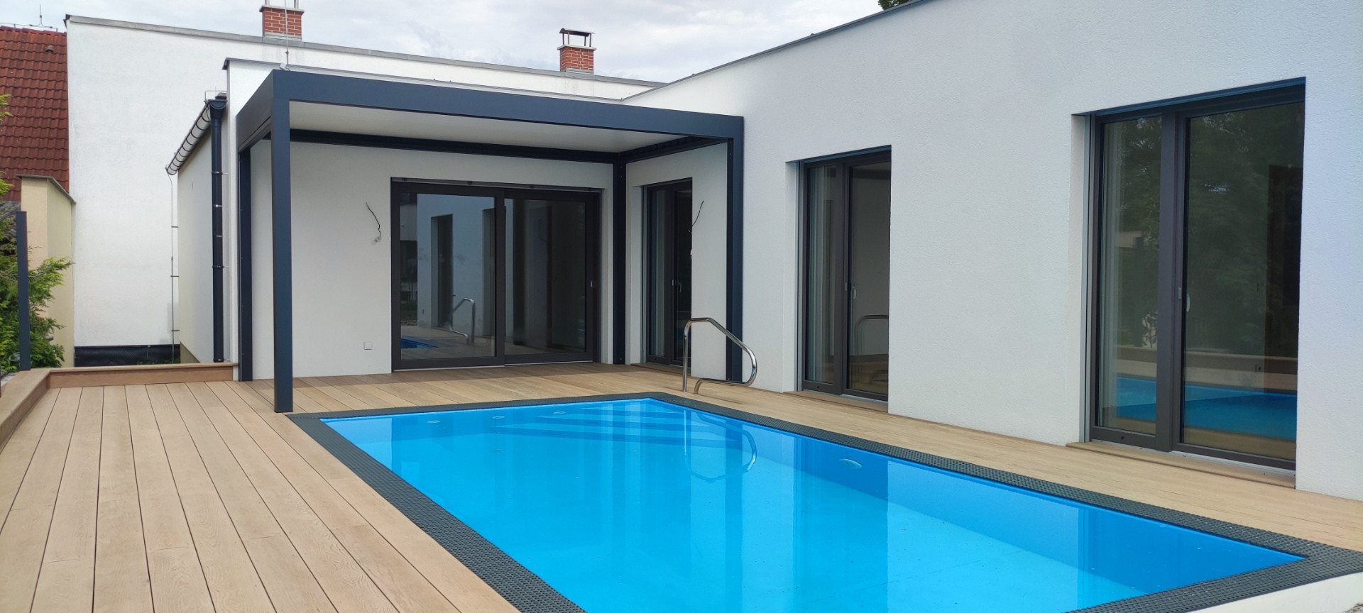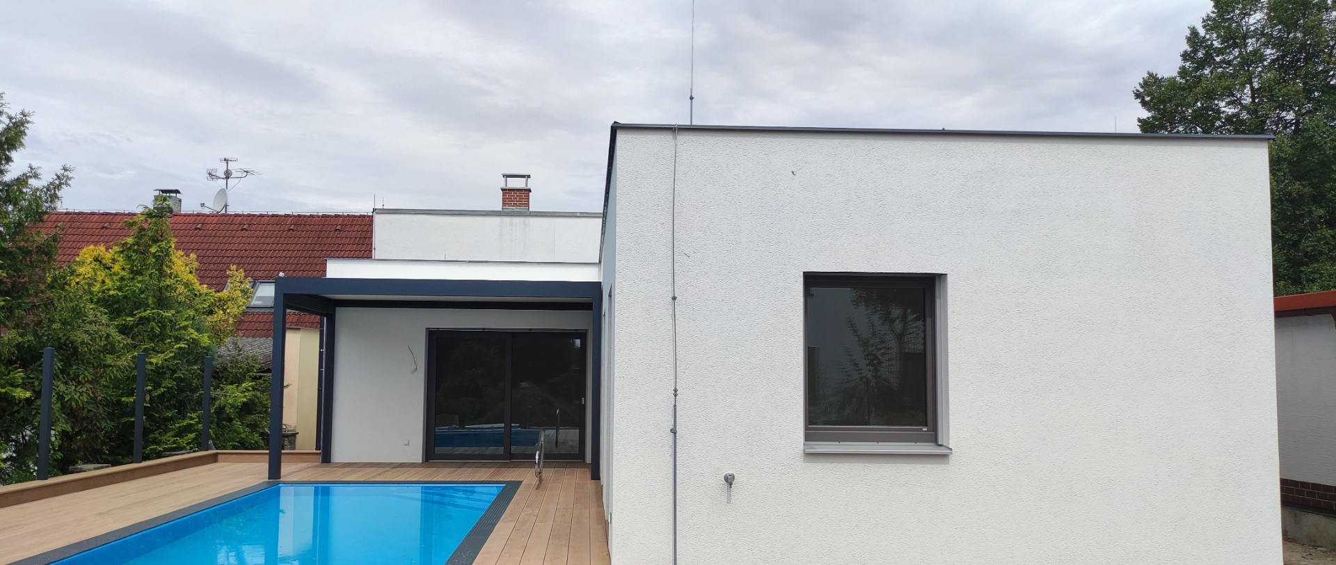 Zveme vás na prohlídku luxusního bungalovu s plochou střechou, který právě dokončujeme v provedení Haas Premium COMPLETE, tedy ihned k nastěhování. Tento bungalov jsme postavili podle individuálního projektu na menším, částečně zastavěném pozemku. Je vybaven nejmodernějšími technologiemi pro pohodlné bydlení a nechybí ani bazén :-)