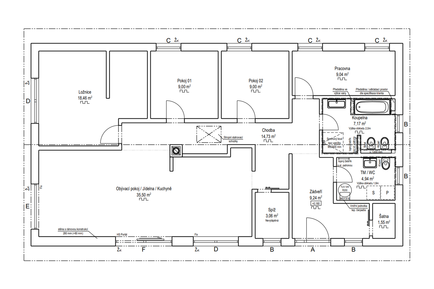 Velmi prostorný obývací pokoj s kuchyňským koutem se skrz HS portál rozšiřuje až na terasu nebo do zahrady. Soukromí poskytnou dva menší pokoje a dostatečně velká ložnice s oddělenou částí pro šatnu. Půdorys doplňuje pracovna, spíž, šatna, koupelna s vanou i sprchovým koutem a technická místnost s dalším WC. Dům je standardně vytápěn podlahovým topením napojeným na tepelné čerpadlo a nechybí ani komín pro připojení krbu nebo krbových kamen. Okna jsou opatřena elektricky ovládanými předokenními žaluziemi, které poskytují nejen ochranou proti slunci, ale spojují dokonalou funkčnost s nejvyšší možnou bezpečností, designovou individualitou a energetickou účinností.