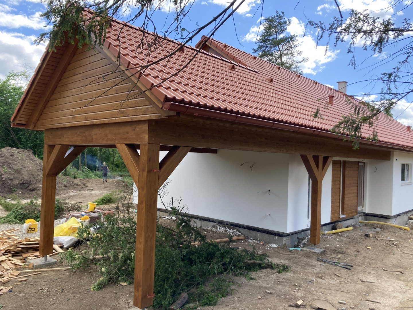 K domu jsme navíc přidali velkorysé parkovací stání z nádherného masivního dřeva, kryté také sedlovou střechou. Střecha stání je protažena až nad vchod, aby bylo možné z auta do domu přejít suchou nohou. Bungalov je vytápěn podlahovým topením napojeným na tepelné čerpadlo. Přitápět si ale klienti mohou vestavným krbem – vyprojektovaným a vyrobeným přímo jim na míru.