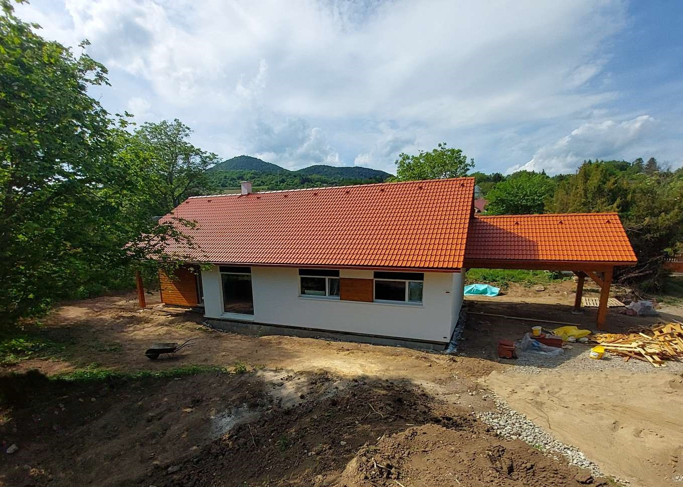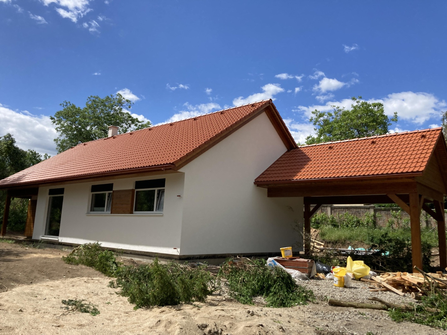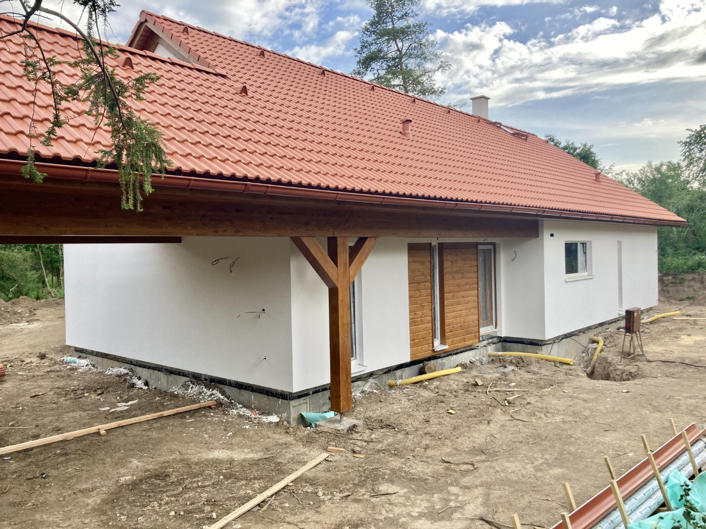 Při výběru ideálního domu pro svou rodinu se klienti inspirovali upraveným půdorysem našeho vzorového domu v Martinově u Brandýsa nad Labem. Aby dům vyhověl všem požadavkům Chráněné krajinné oblasti České středohoří, bylo nutné původní valbovou střechu nahradit sedlovou v červené barvě, která domu rozhodně sluší. Zvlášť, když jsme k ní barevně doladili dřevěný obklad fasády i ostatní dřevěné prvky. Bílou fasádu pak skvěle doplňují bílá okna s elektricky ovládanými předokenními žaluziemi.