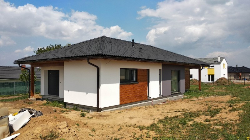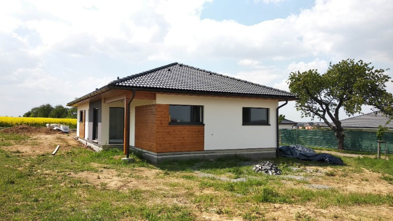Přestože se jedná o typový projekt, na přání majitelů jsme udělali pár individuálních úprav a přidali pár nadstandardních prvků. Například vjezd do garáže je netradičně z boční strany domu, celý bungalov je vytápěn podlahovým topením a okna lze zatemnit integrovanými roletami.