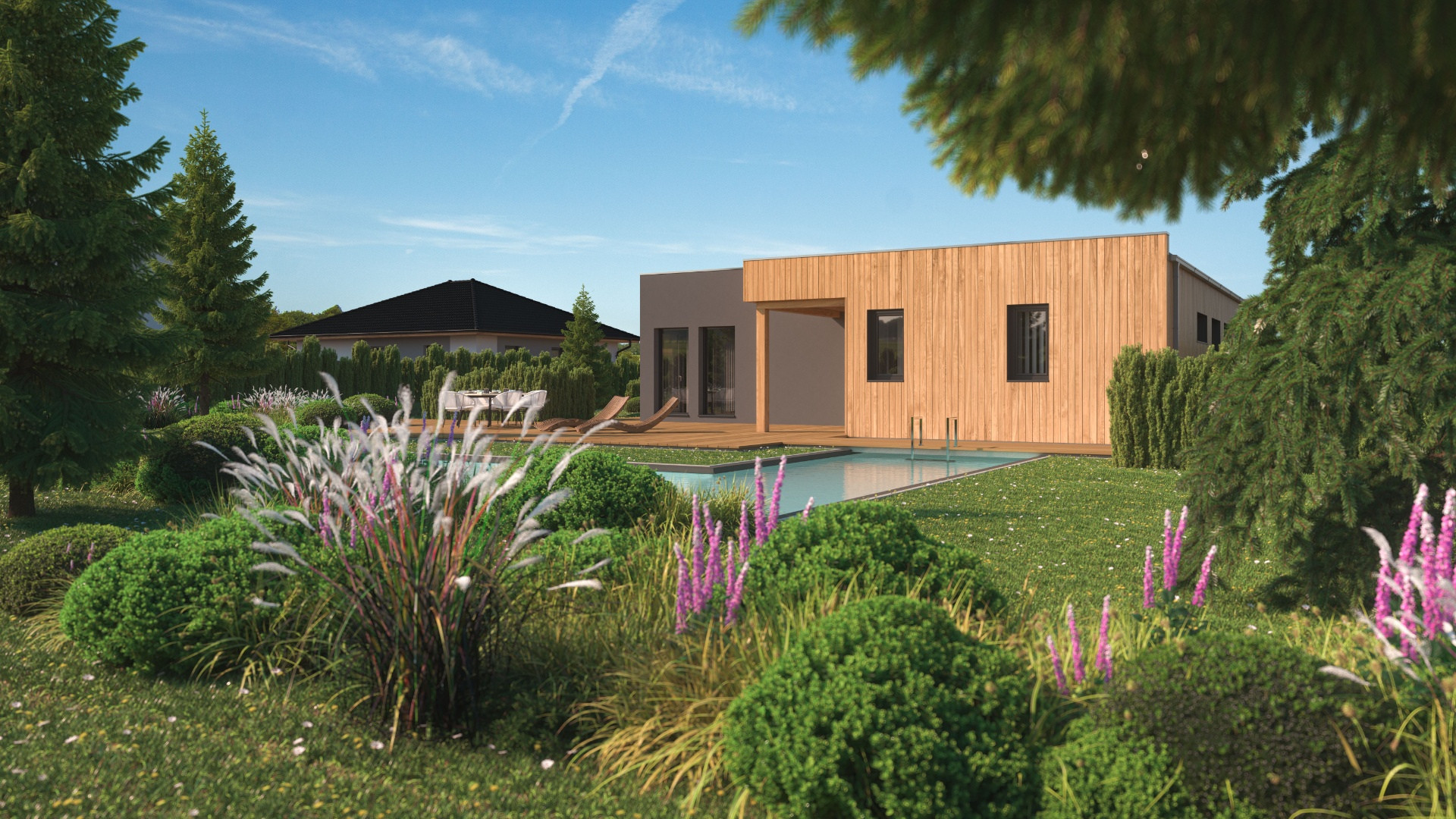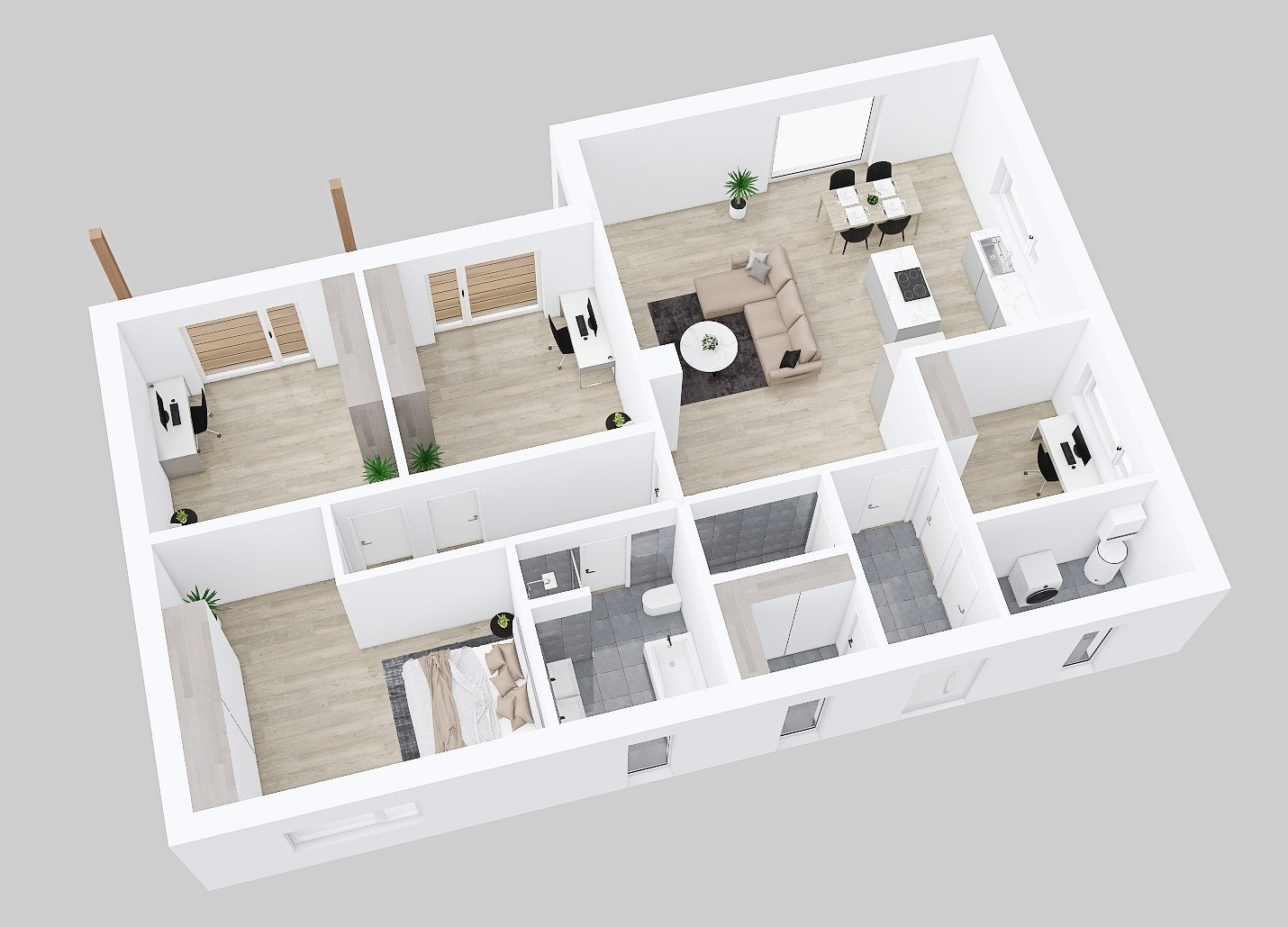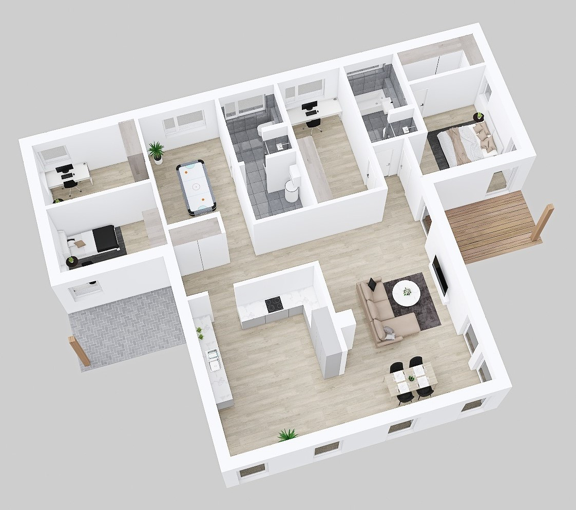 Každý modulový dům 5+kk se vyznačuje velkým obývacím pokojem propojeným s kuchyní, třemi pohodlnými ložnicemi, pracovnou a hernou nebo pokojem pro hosty. Dostatek úložného prostoru najdete v šatnách i technické místnosti.