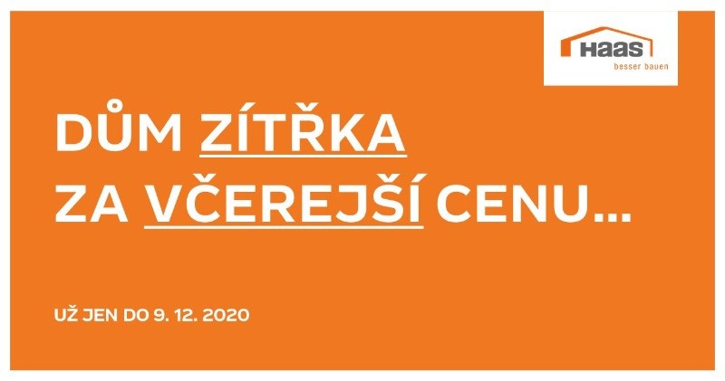 Nejvyšší kvalita použitých materiálů a stále se zvyšující ceny vstupních nákladů sebou přinášejí nezbytné zdražení. Pokud ale do 9. prosince 2020 uzavřete Smlouvu o dílo na vámi vybraný rodinný dům, zafixujeme vám současnou nižší cenu dokonce až do 31. 5. 2022!!! Vy tak získáte čas na vyřízení veškerých formalit a zajištění financování nového domu. Zároveň můžete využít bonus 100 000 Kč na na novou kuchyň. Podmínkou je převzetí spodní stavby pracovníkem HF do 15. 12. 2021.