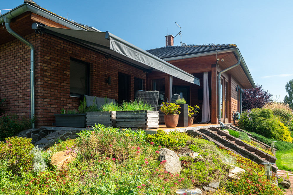 Individuálně navržený bungalov 4+kk s terasou jsme s klienty od počátku plánovali tak, aby odpovídal nejen současným potřebám, ale i pohodlí v pozdějších letech života. Je bezbariérový, a přestože je situovaný ve svahu, schody tady nenajdete. Výjimkou je jen pár stupňů, které vedou z terasy na zahradu.