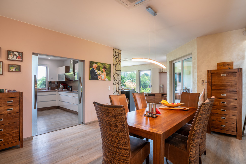 Majitelé v nedávné době učinili několik životních kroků. Poté, co jejich děti odrostly a odstěhovaly se, se rozhodli po dvaceti letech společného života vzít a pořídit si bydlení, které bude splňovat jejich představy. Našli ideální pozemek u rybníka, kde si vysnili vlastní dům. A měli hned jasno – dřevostavba na klíč 4+kk byla ideální volbou. Chtěli úsporné, rychlé a spolehlivé bydlení, které bude pocitově teplé a zároveň zapadne do krajiny. Protože neměli se stavbou domu předchozí zkušenosti, nechali si od přátel doporučit nejlepší firmu na dřevostavby na trhu, společnost Haas Fertigbau.