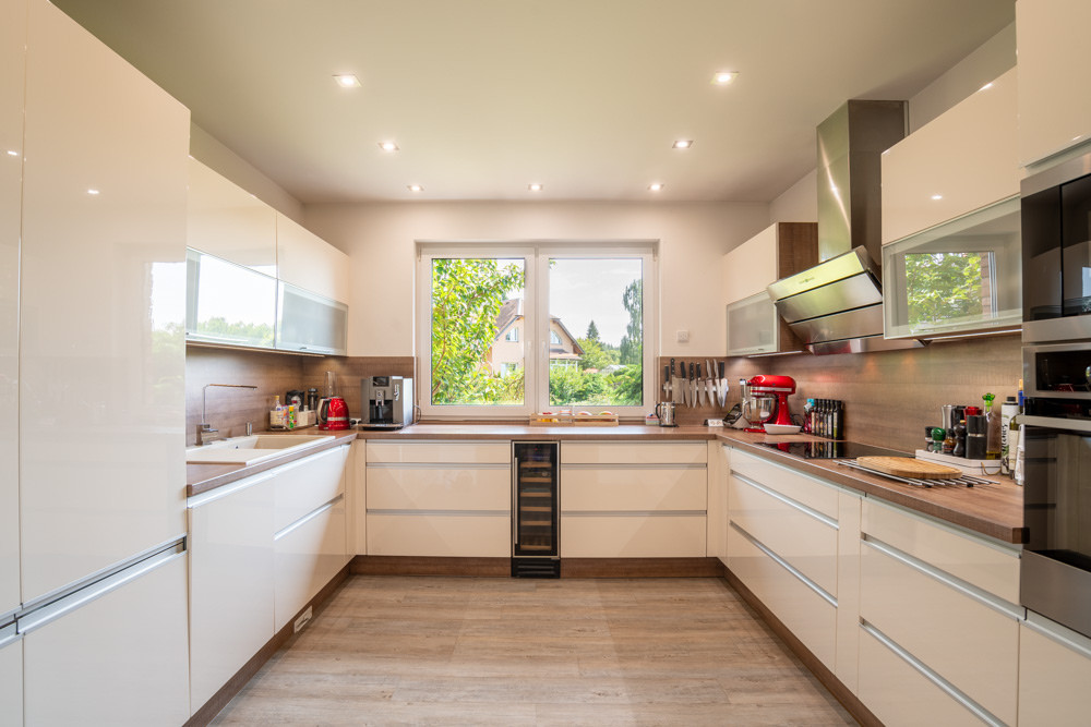 Majitelé milují víno a vaření, proto věnovali velkou pozornost kuchyni. Ta je navržená jako samostatná místnost, oddělená od jídelny elegantními skleněnými dveřmi, umožňuje klidné vaření i společenské večery. Nechybí ani vestavná vinotéka.