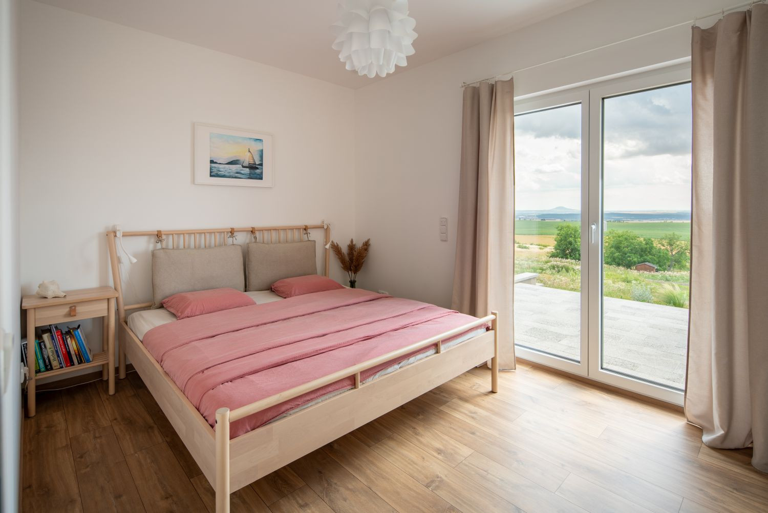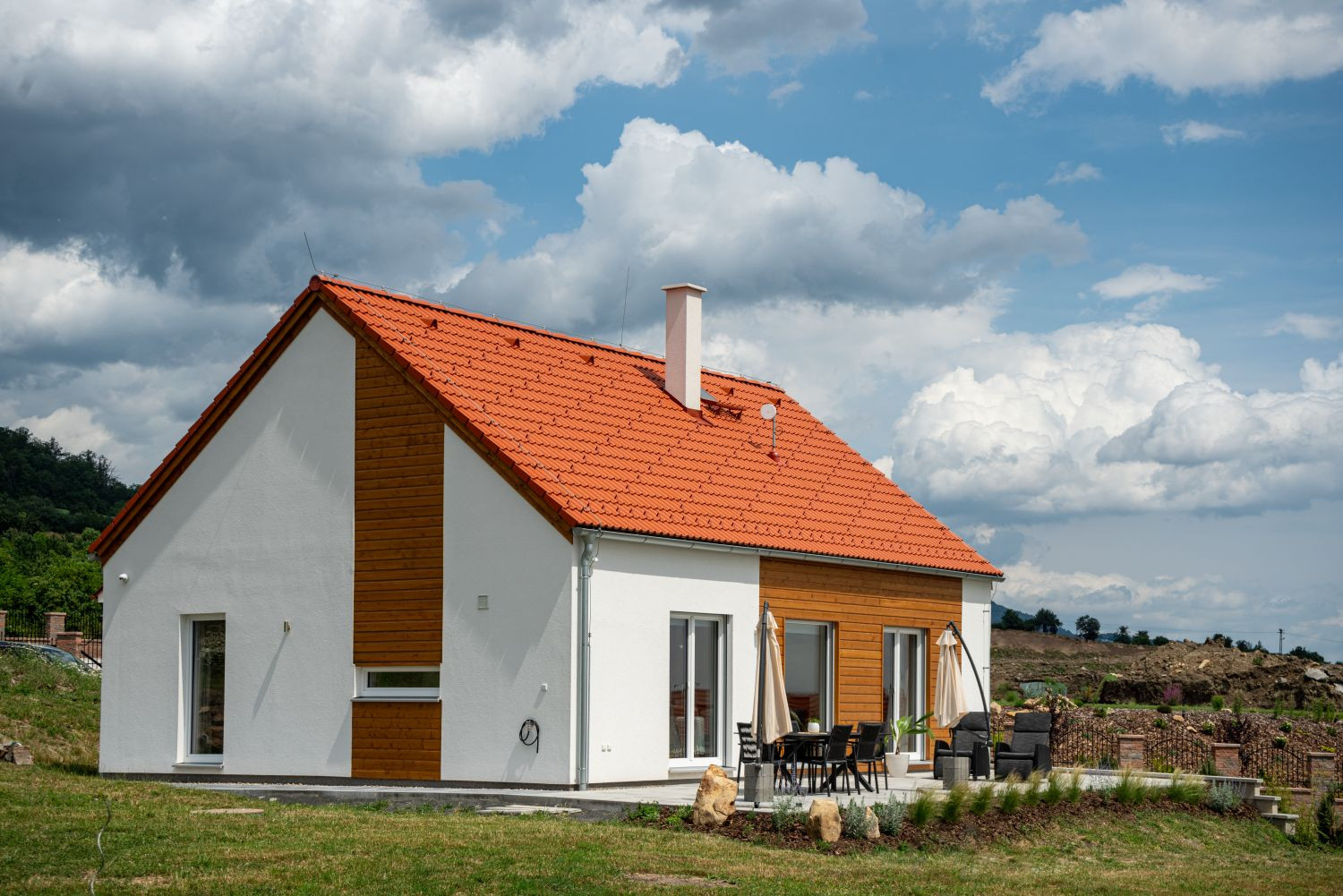 Vyřídit povolení trvalo přesně rok. Jirka si jednání se všemi úřady poctivě vyřídil sám, což v době covidové krize nebylo jednoduché. Rodina si svůj vysněný dům vybrala z katalogu, dokonce úplně nový typ, který se na našem trhu teprve zaváděl. Petru totiž zaujala velká okna, která propojují bydlení s okolní přírodou. I přes vyšší cenu se rozhodli pro přízemní řešení – bungalov, hlavně kvůli tepelnému komfortu v létě. I tak ale bylo potřeba udělat některé změny, ať už kvůli orientaci domu, která byla v katalogu jiná, ale také kvůli jejich potřebám. Stejně tak museli brát ohledy na regulace stavebního úřadu a CHKO České Středohoří, jehož čtvrtá zóna sem zasahuje.