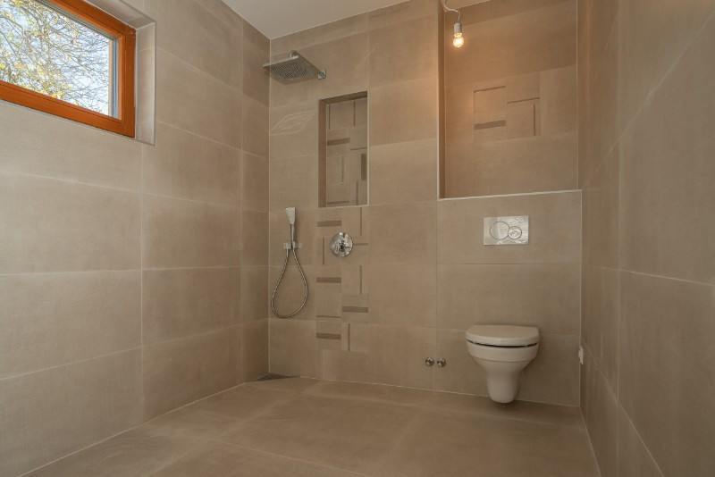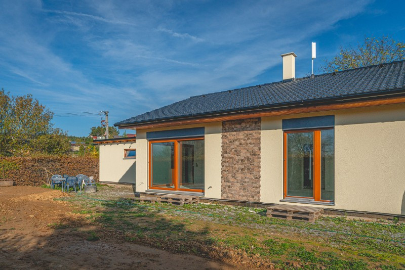 Nadstandardní jsou také dřevěná okna, elektrické topné kabely v podlahách nebo komín s přípravou pro připojení krbových kamen. Dřevostavba je velmi energeticky šetrná a je připravena na připojení fotovoltaických panelů.