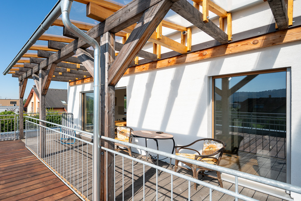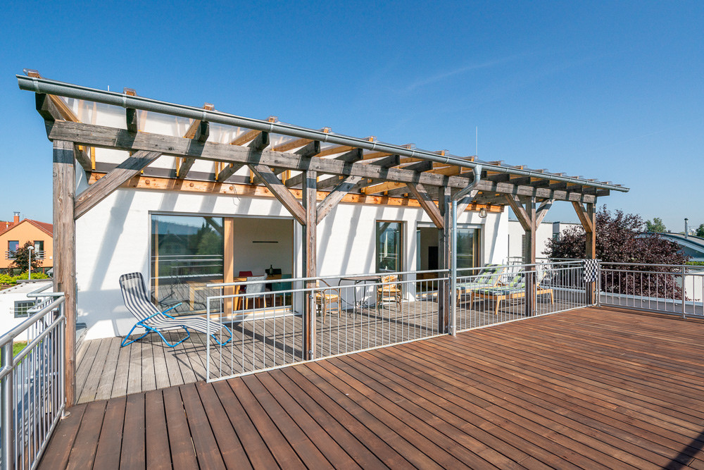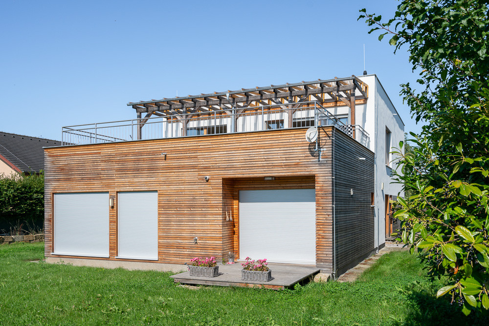 Rozsáhlá terasa slouží jako letní obývák. Částečně je zastřešená pergolou, částečně otevřená, poskytuje prostor pro posezení i grilování. Pergola je z kvalitního sibiřského modřínu, který je téměř bezúdržbový. Terasa je také Hynkovým oblíbeným místem. „Terasu využívám hlavně v létě, když je hezké počasí. Na zastřešené části si rád sednu a třeba jen čtu knížku nebo si dám kávu s přáteli. Na té druhé, otevřené, by se s trochou nadsázky dalo i tančit,“ směje se Hynek.