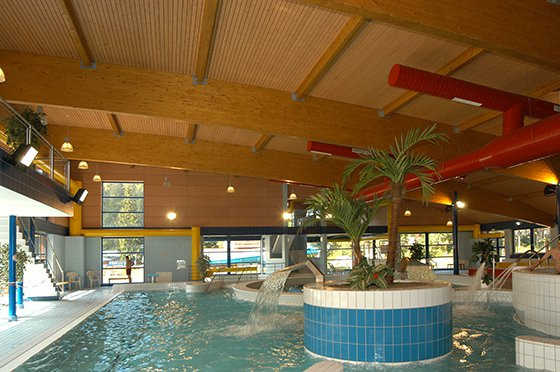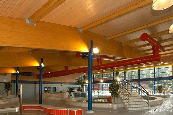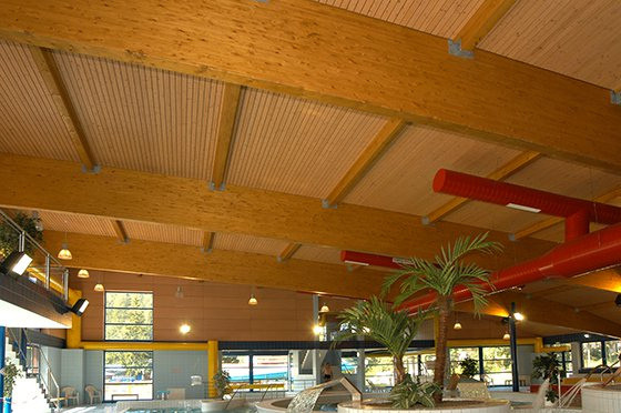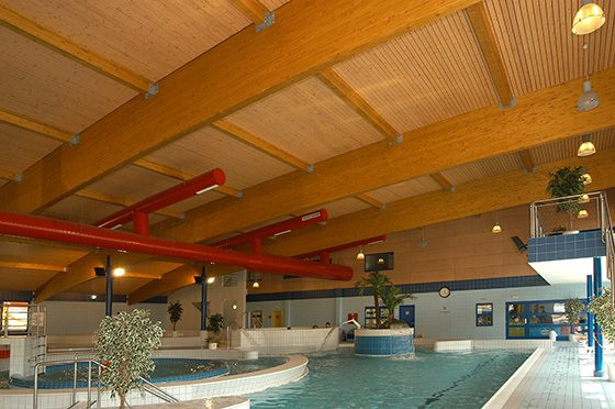 Stejně tak ukázkou naší profesionální práce se dřevem je i konstrukce zastřešení aquaparku, kterou podpírají lepené lamelové nosníky.
