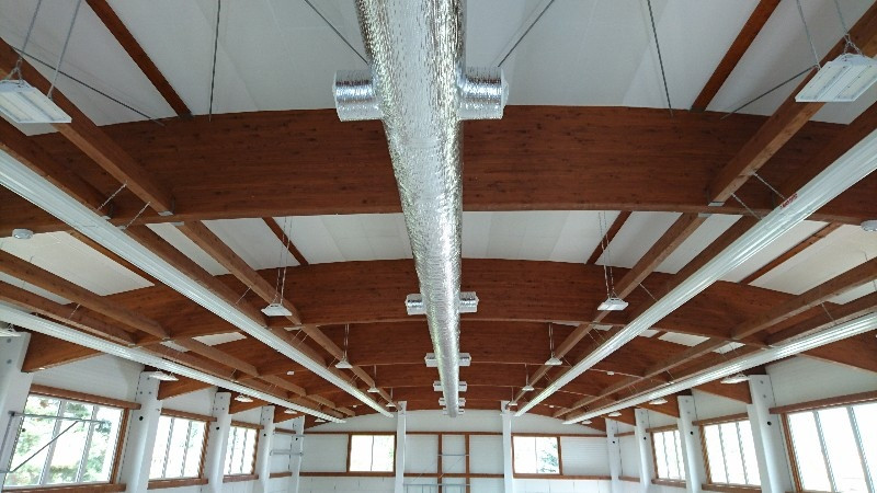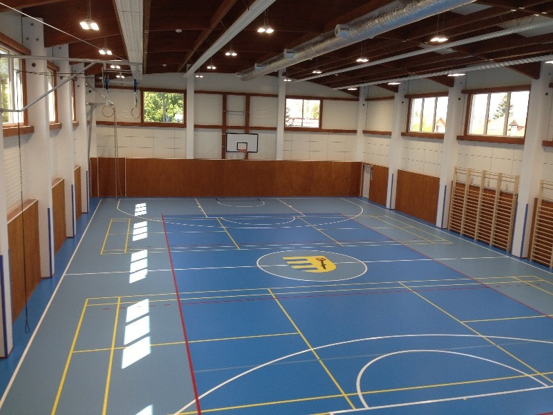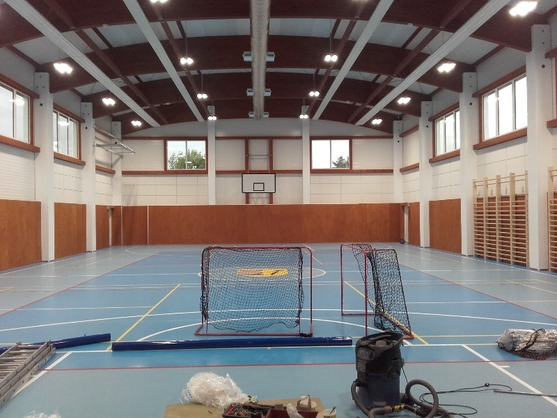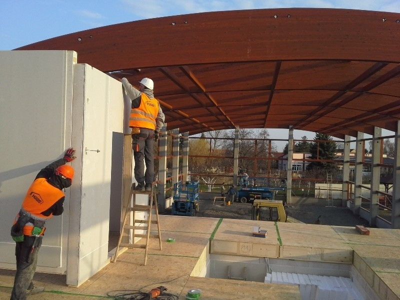 Celá vestavba zázemí 1. NP, 2. NP a půdního prostoru je samonosná konstrukce, řešená principem montované dřevostavby. Nosníky střechy jsou navrženy z klenutých vazníků z lepeného lamelového dřeva GL36h uložených na železobetonových pilířích. Opláštění tělocvičny je z PUR panelů, které jsou uloženy na železobetonové prahy a po celé výšce stavby kotveny železobetonové pilíře. Interiér tělocvičny je kombinací materiálů v bílé barvě v kontrastu s dřevěnými prvky. Podhled tvoří bílé, perforované akustické panely.