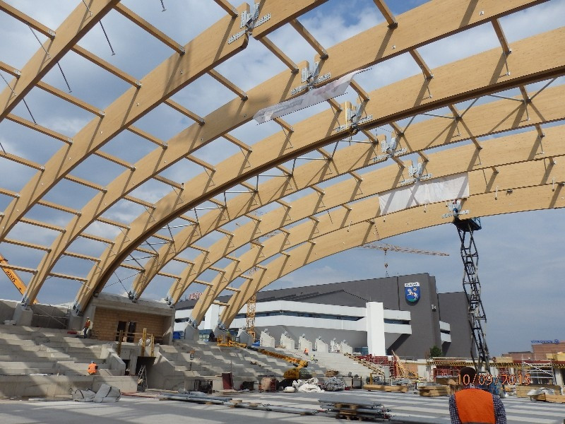 Zpět na účelové stavbyHaas Fertigbau Chanovice vyráběl hlavní nosné prvky (lepenou dřevěnou střešní konstrukci) a střešní panely pro sportovní halu v Ostravě-Vítkovicích o půdorysných rozměrech 62 × 94 m.