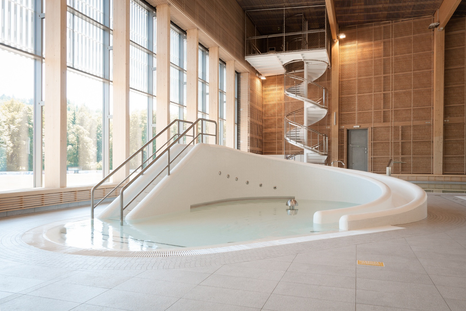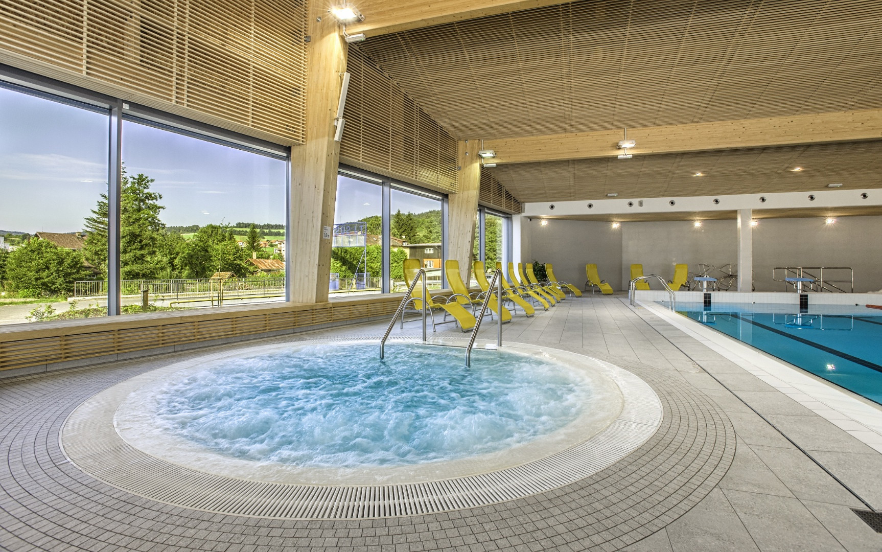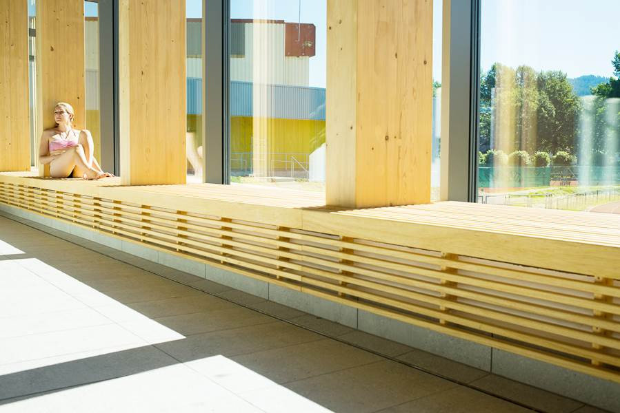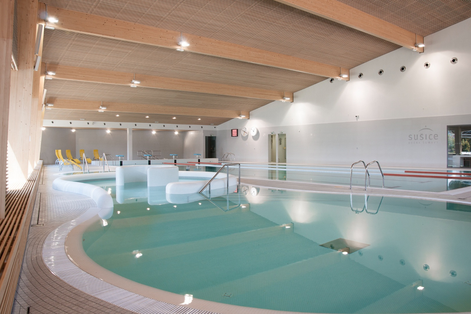 Zpět na účelové stavbySpolečnost Haas Fertigbau se podílela na stavbě plaveckého bazénu v Sušici na Plzeňsku, kde realizovala nosnou konstrukci střechy a bočních stěn z prvků z lepeného lamelového dřeva.
