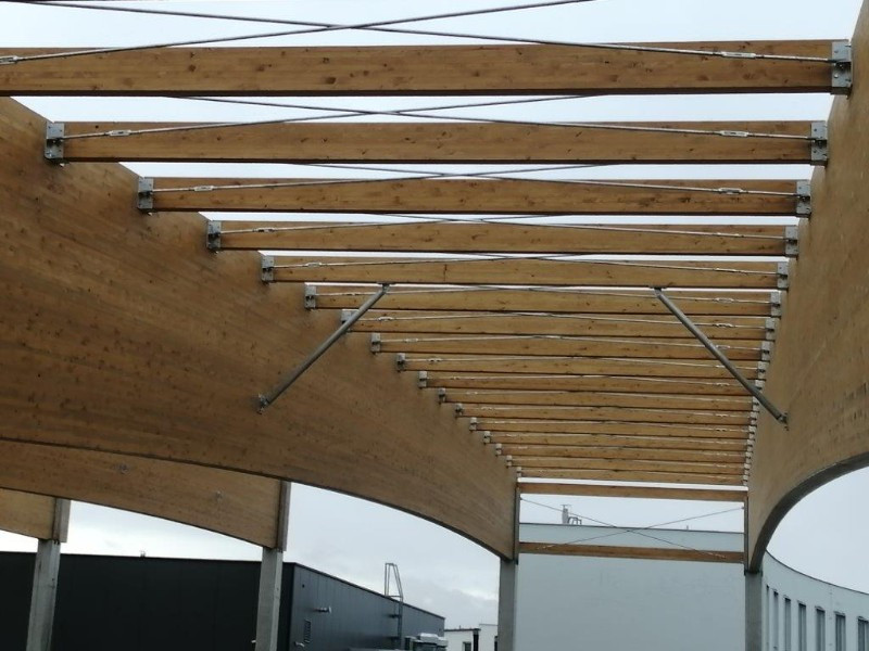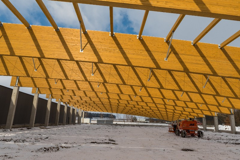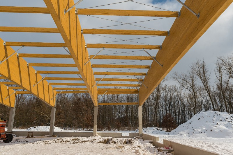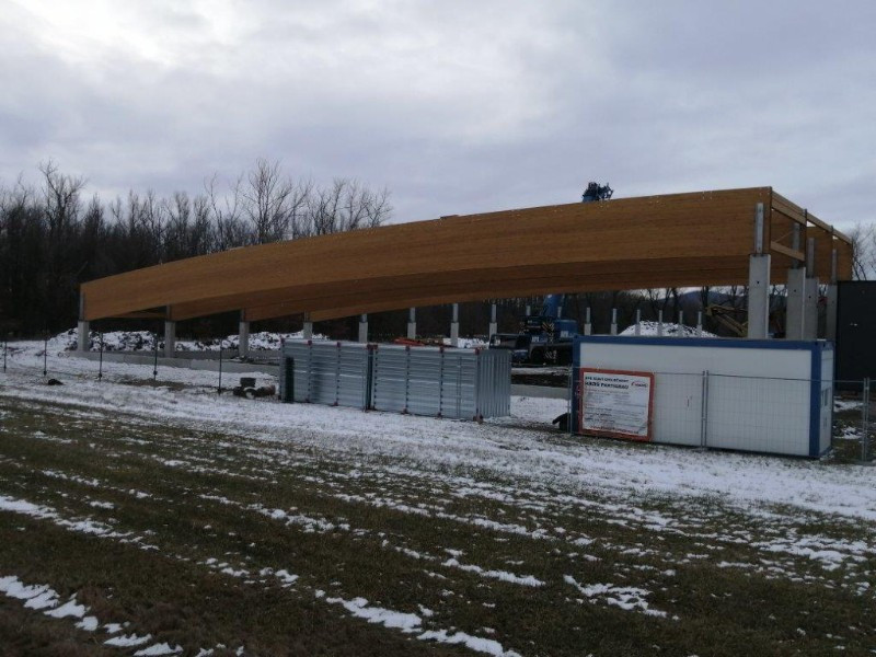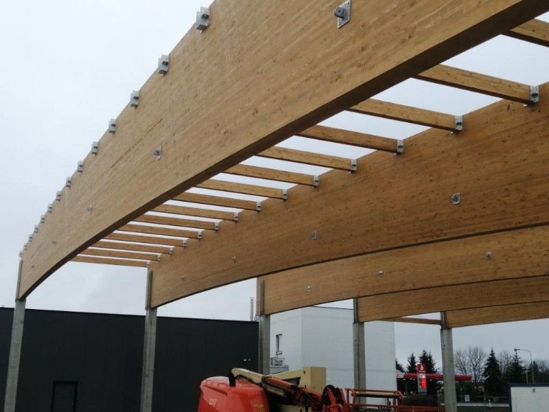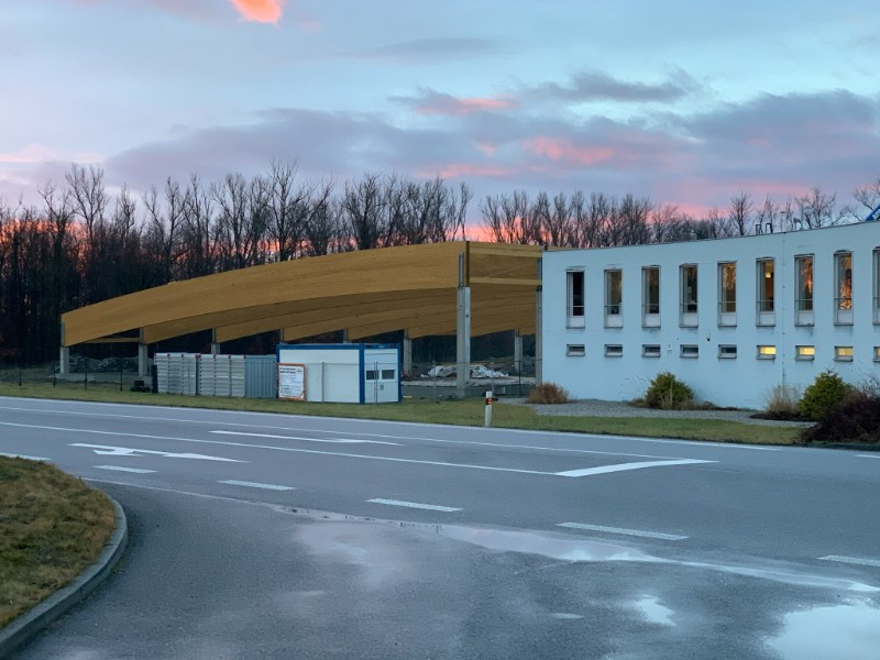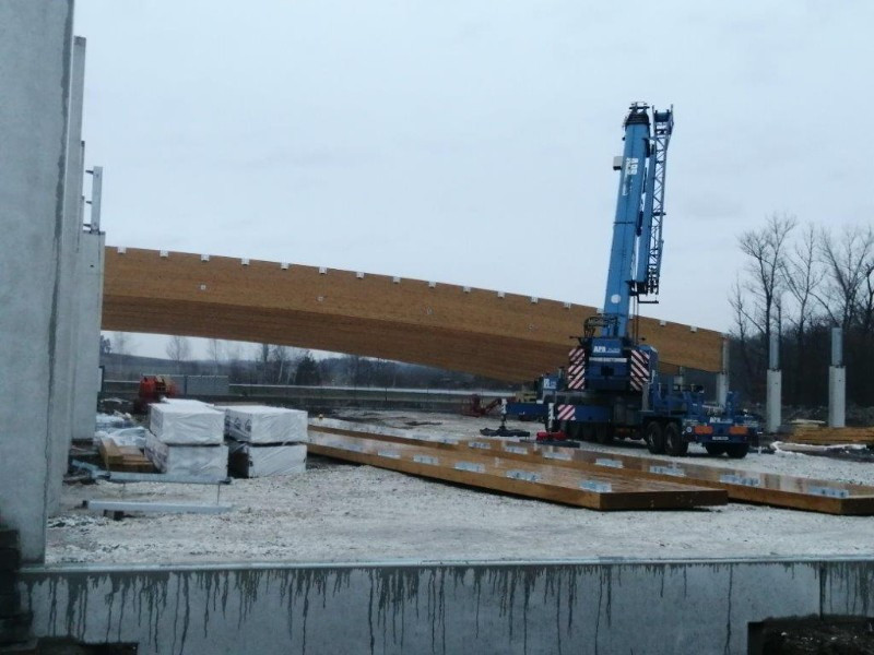 Zpět na účelové stavbyHlavní nosná konstrukce střechy je tvořena z lepených lamelových nosníků o rozměrech 240 x 2 400 x 30 600 - 41 500 mm (tvar oblouk) a rozpěrných vaznic 160 x 280 mm, pevnost dřeva je GL24h, průmyslová kvalita.