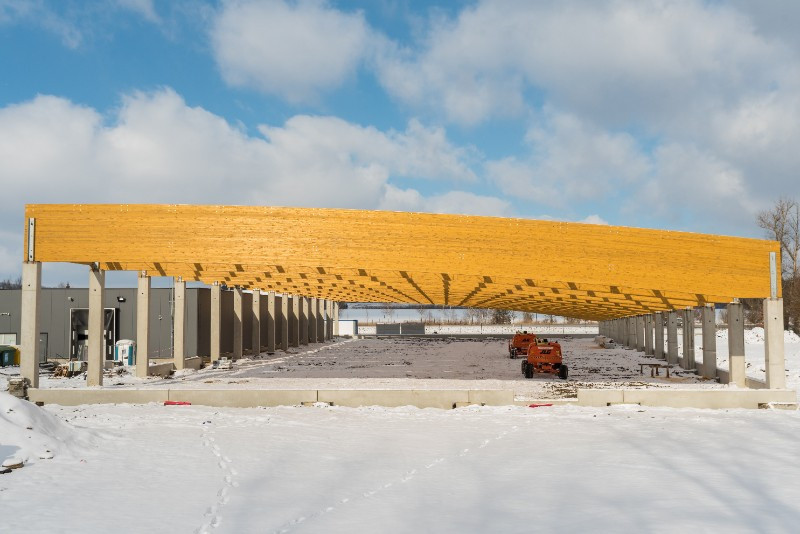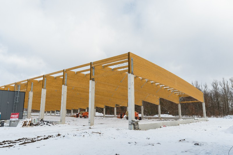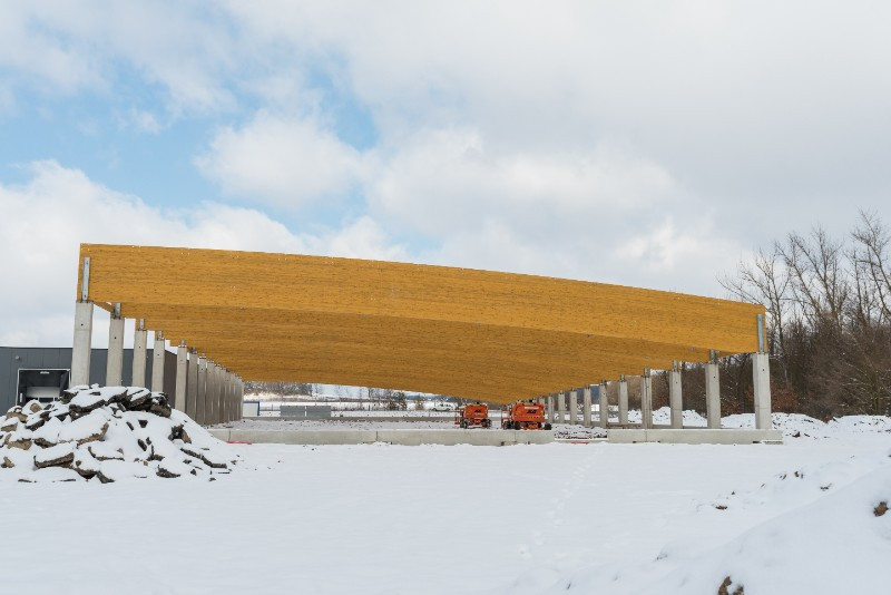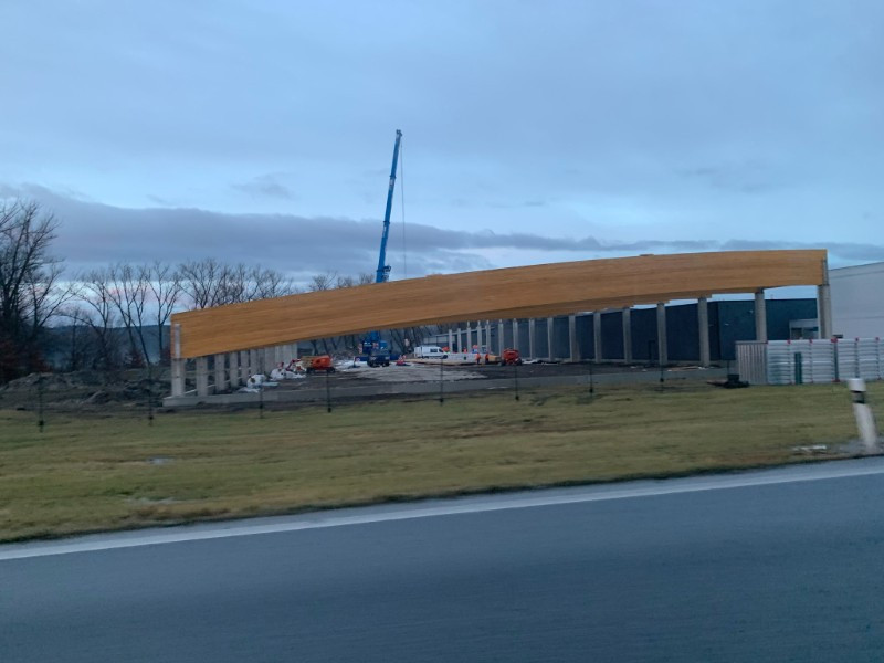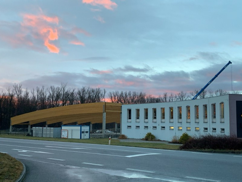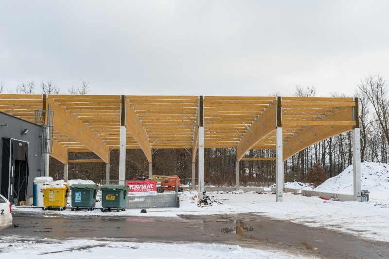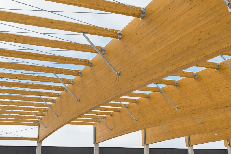 Zpět na účelové stavbyHlavní nosná konstrukce střechy je tvořena z lepených lamelových nosníků o rozměrech 240 x 2 400 x 30 600 - 41 500 mm (tvar oblouk) a rozpěrných vaznic 160 x 280 mm, pevnost dřeva je GL24h, průmyslová kvalita.