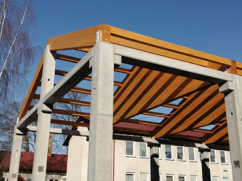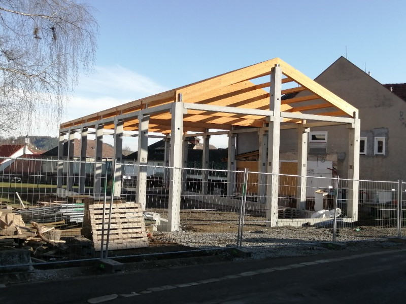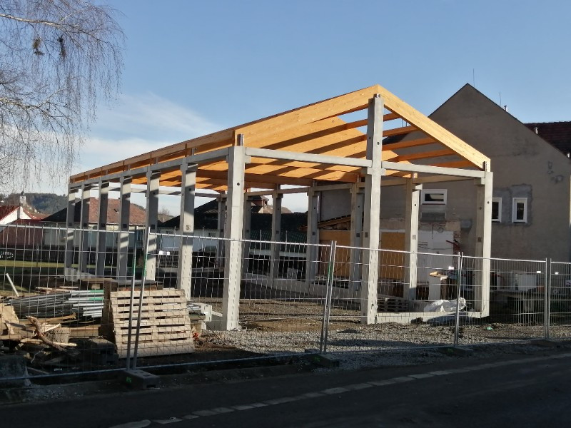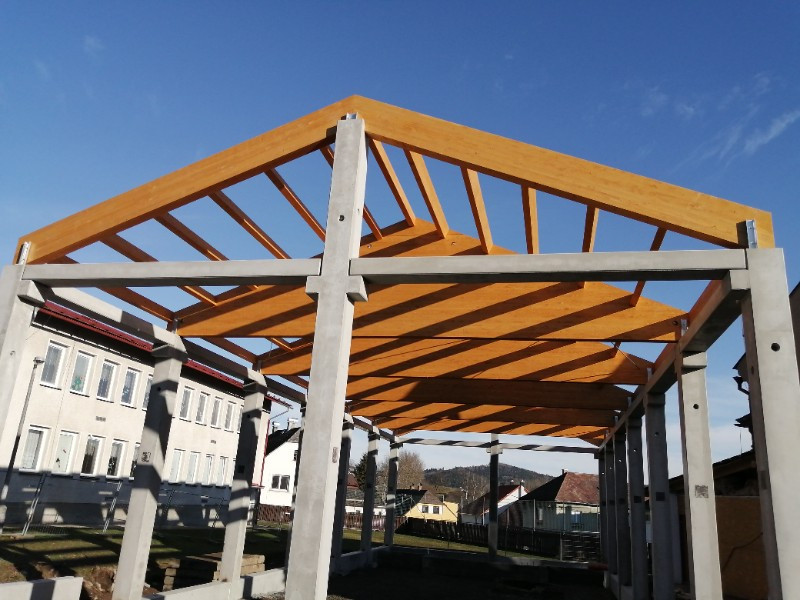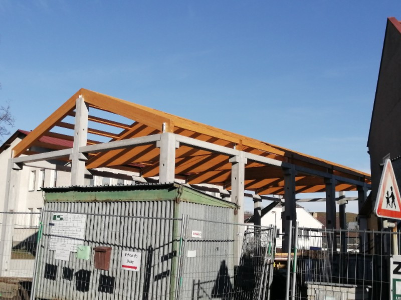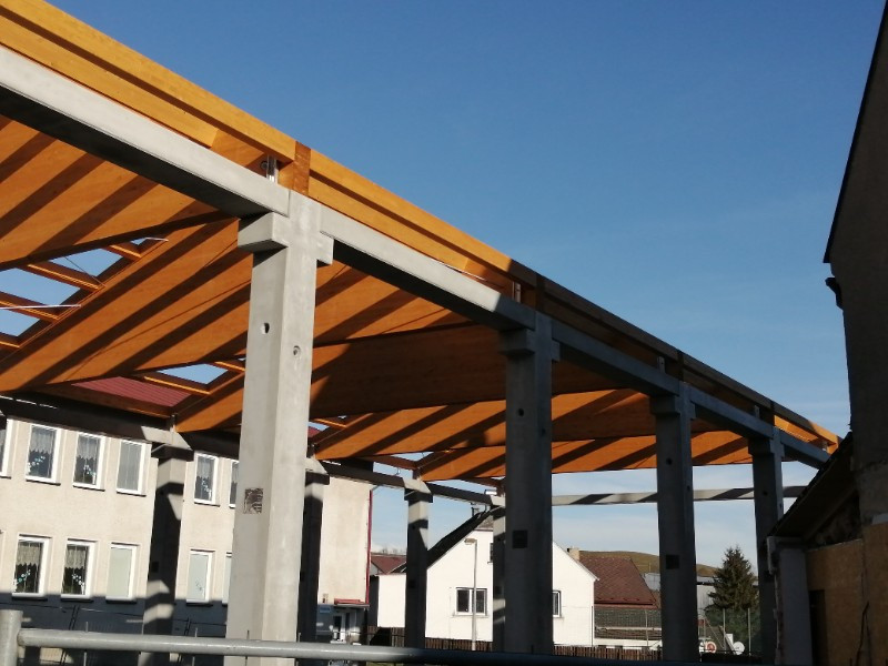 Zpět na účelové stavbyHlavní nosná konstrukce střechy je tvořena z lepených lamelových nosníků sedlového tvaru o rozměrech 200 x 490 - 2 692 x 10 900 mm a rozpěrných vaznic 120 x 240 mm, pevnost dřeva je GL24h, pohledová kvalita, vše v nátěru od firmy Adler.