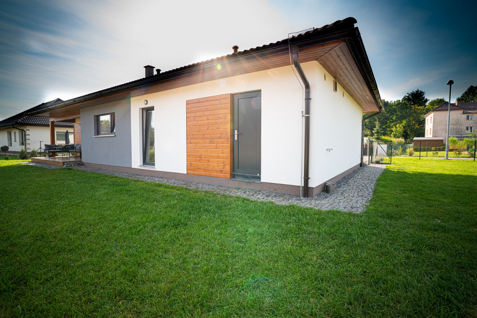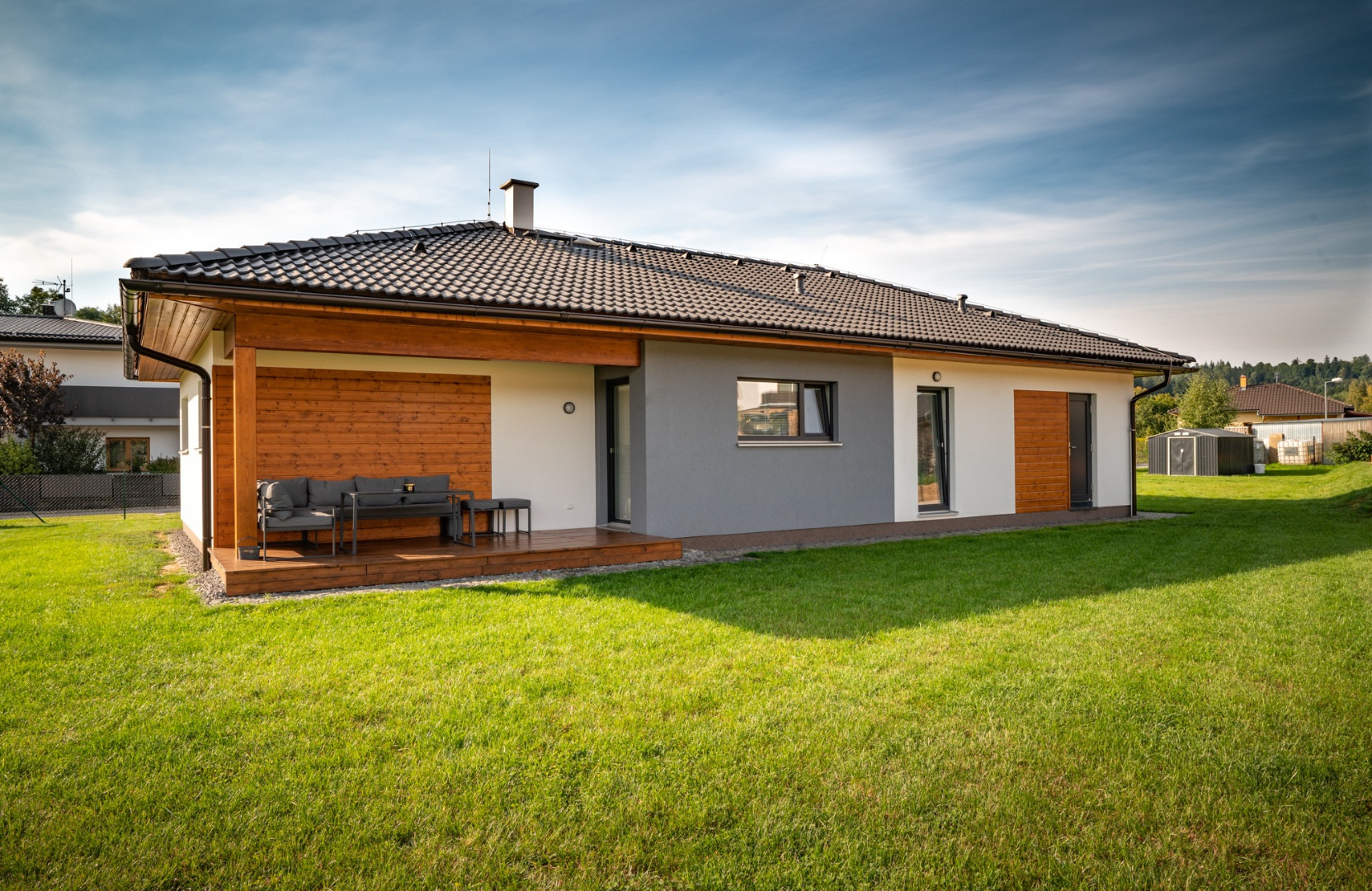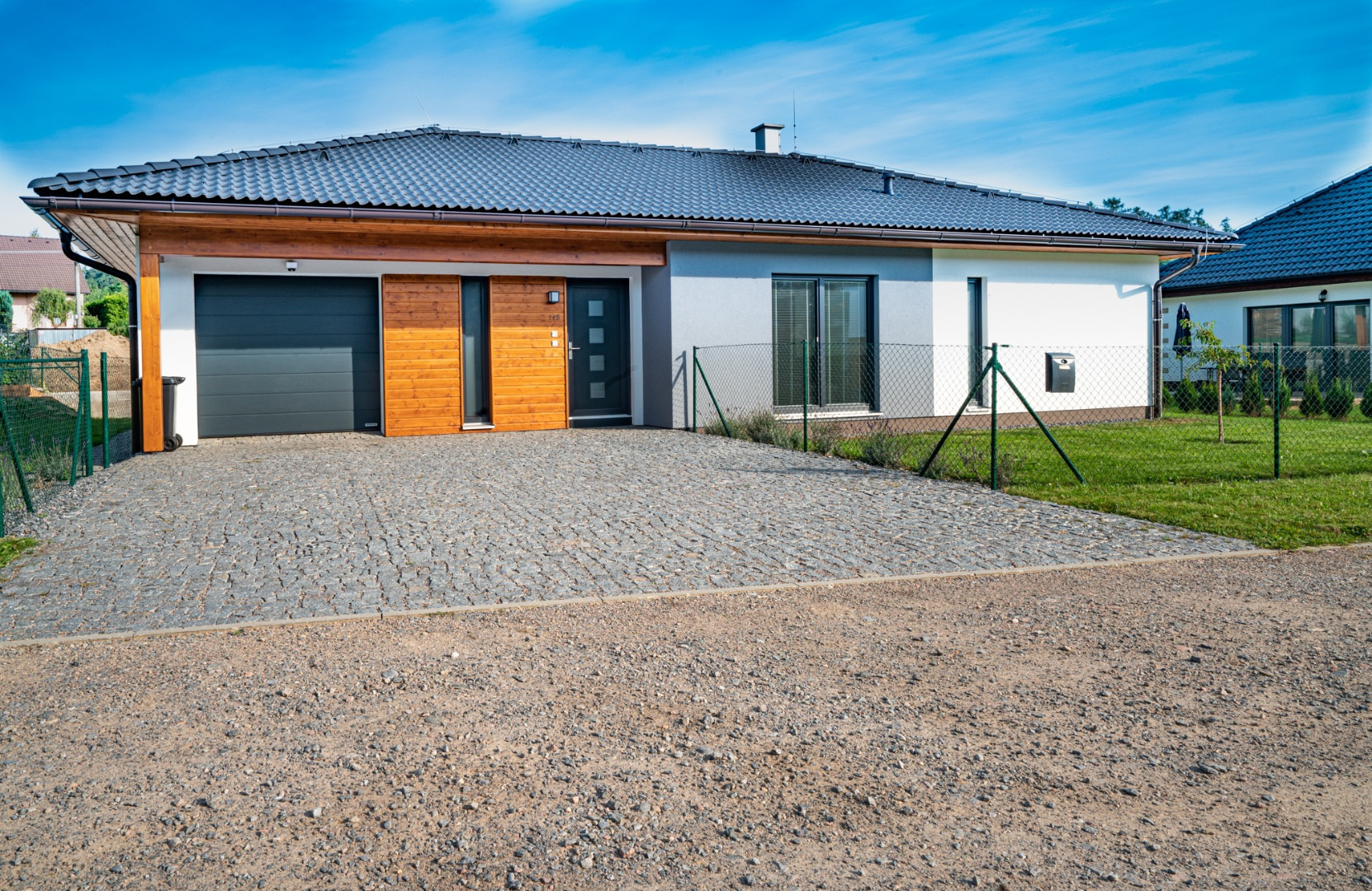 v Poříčí u Litomyšle můžete navštívit typový bungalov Instinkt, s individuálními úpravami. Standardně nabízí přes 108 m2 užitné plochy na 134 m2 plochy zastavěné. Kromě čtyř pokojů a kuchyňského koutu v něm najdete také prostor pro dvě koupelny, technickou místnost a sklad. Velkým plusem je garáž, která je součástí domu.
