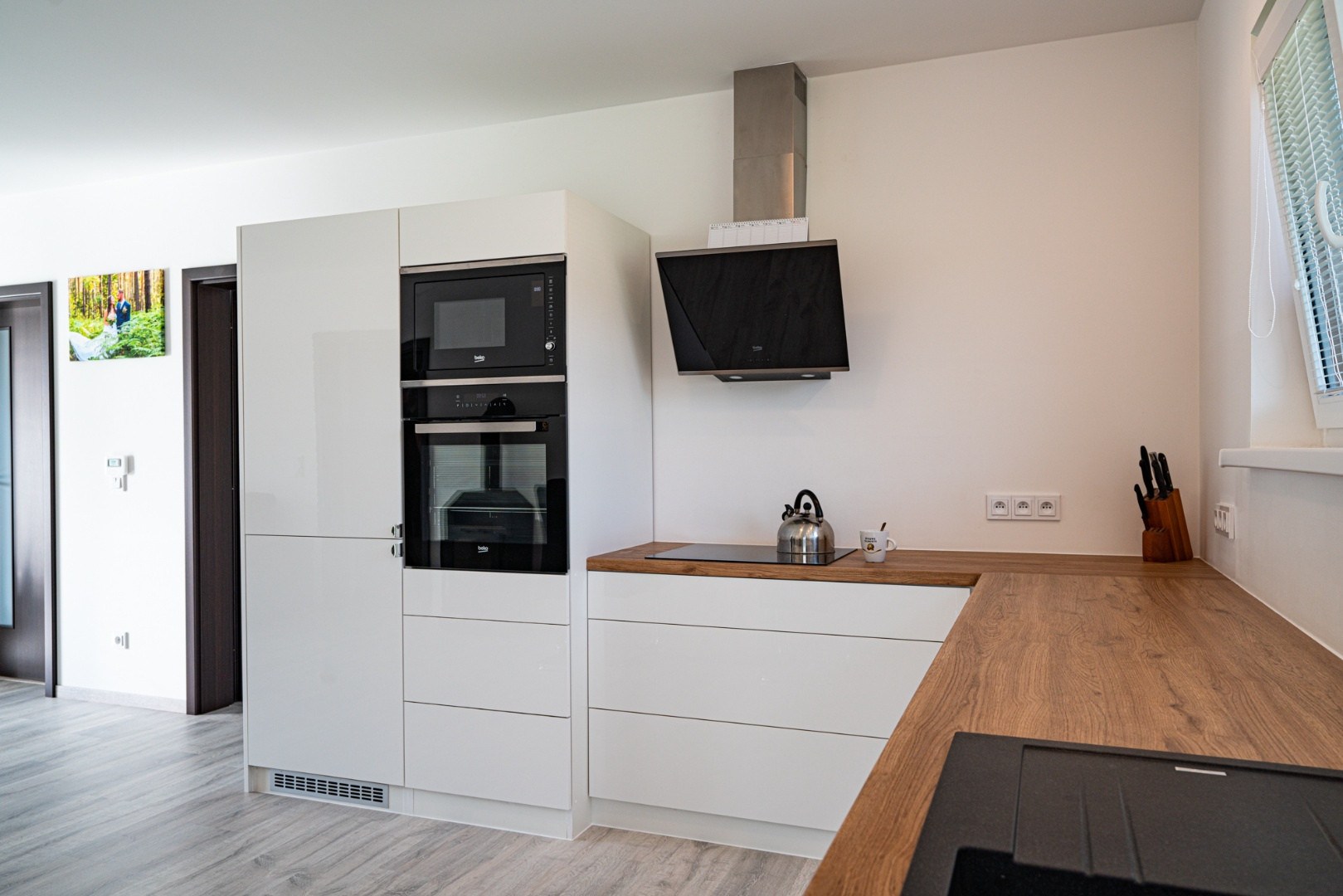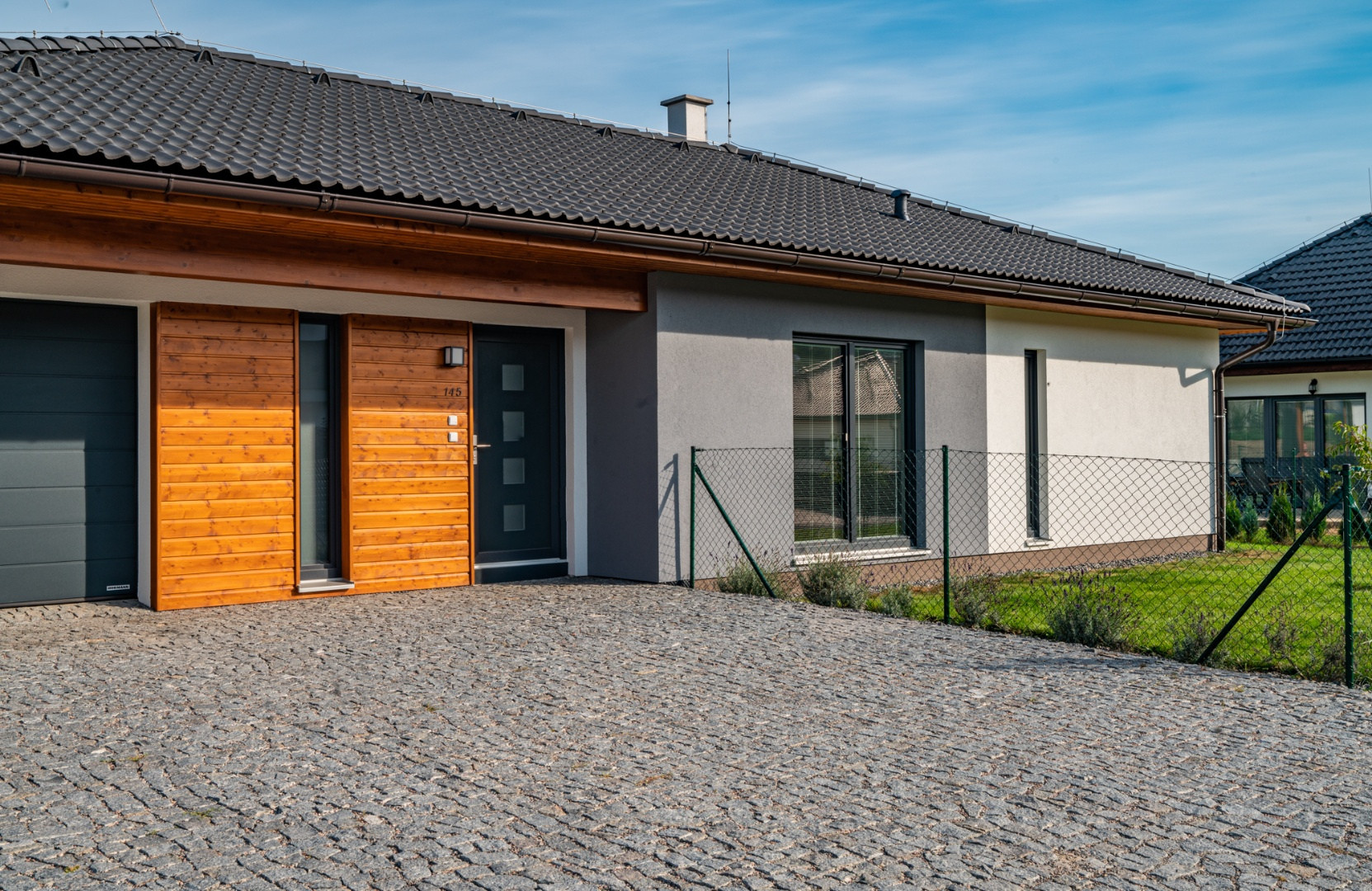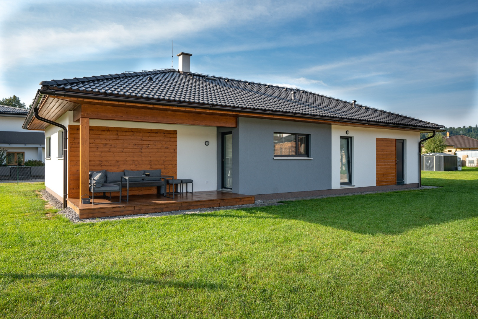 v Poříčí u Litomyšle můžete navštívit typový bungalov Instinkt, s individuálními úpravami. Standardně nabízí přes 108 m2 užitné plochy na 134 m2 plochy zastavěné. Kromě čtyř pokojů a kuchyňského koutu v něm najdete také prostor pro dvě koupelny, technickou místnost a sklad. Velkým plusem je garáž, která je součástí domu.