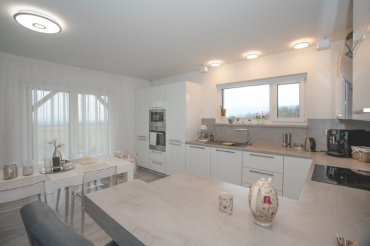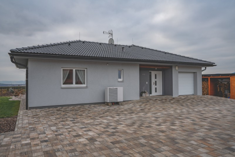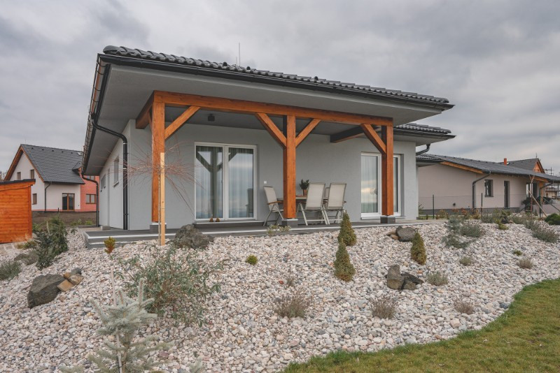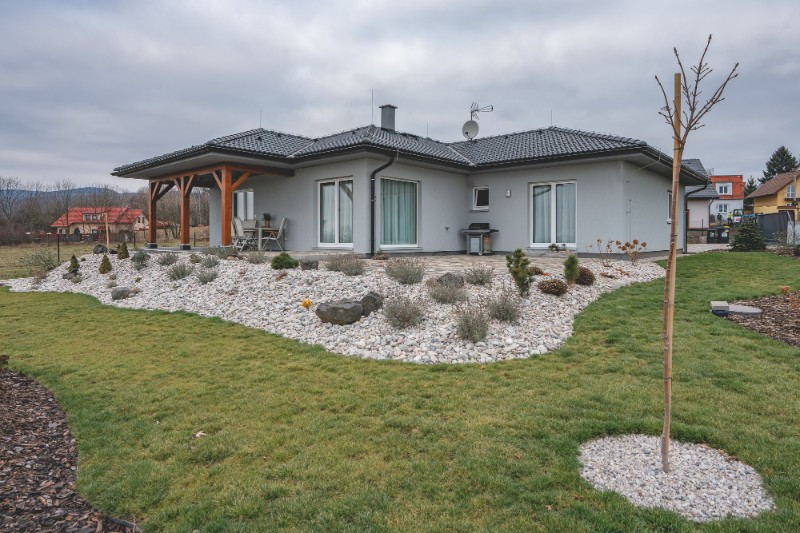 Bungalov podle individuálního projektu vyrostl za 9 měsíců od podpisu smlouvy v roce 2018. Ukrývá dispozici 3+KK s garáží a součástí je kromě jiného komín, předokenní rolety, tepelné čerpadlo nebo teplovodní podlahové vytápění.